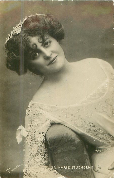 PHOTO L. CASWALL SMITH wearing lace low cut dress, leaning left on back of couch, same image P152 Marie Studholme (1872 Eng.-1930 London ) married Gilbert Porteous 1891 and then Div. 2nd Husband Harold Giles 1908;