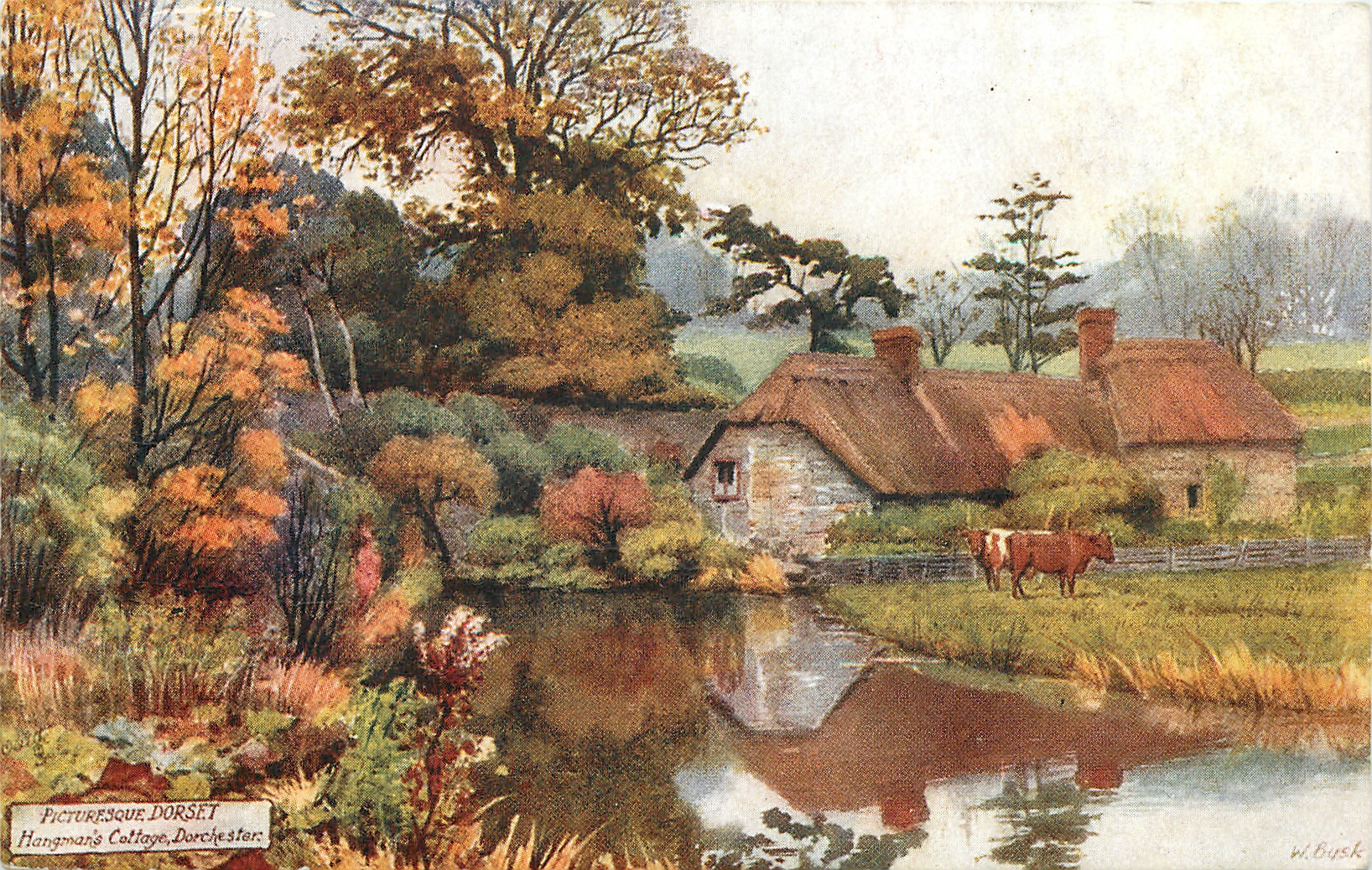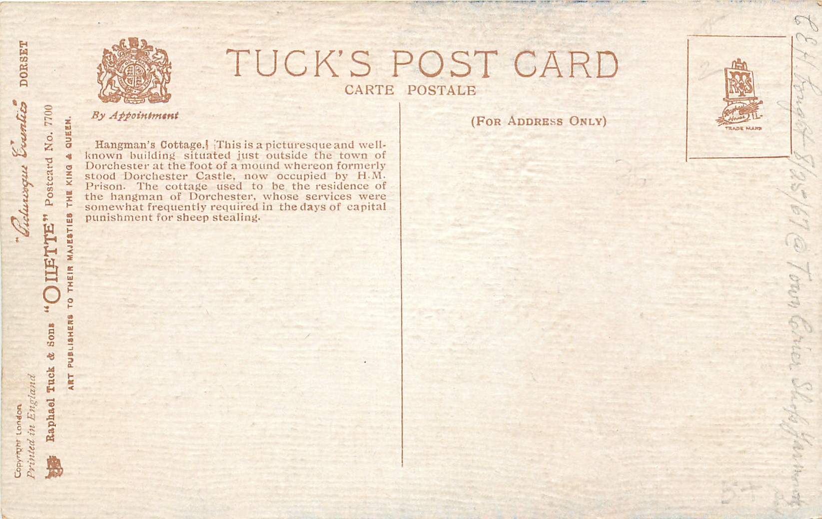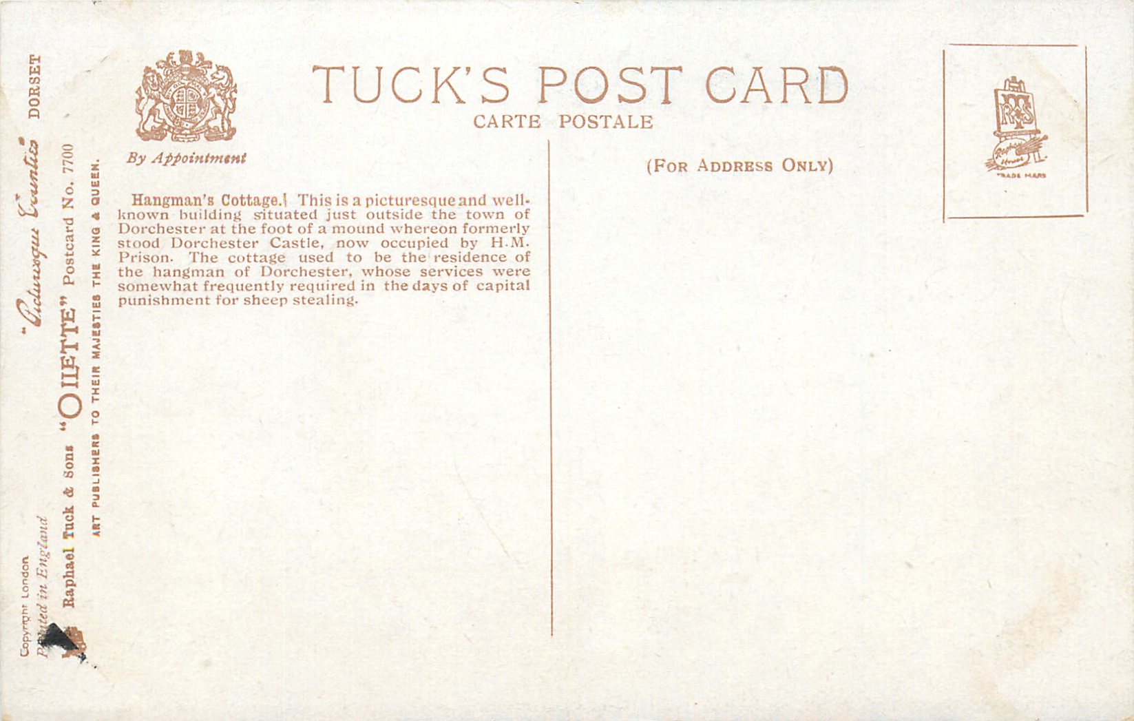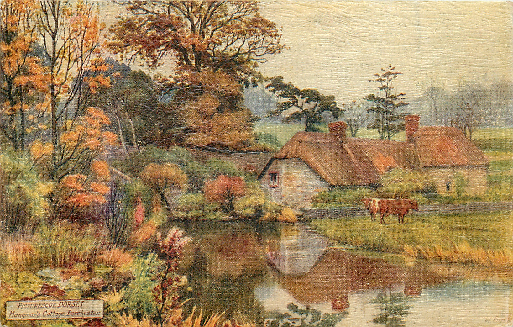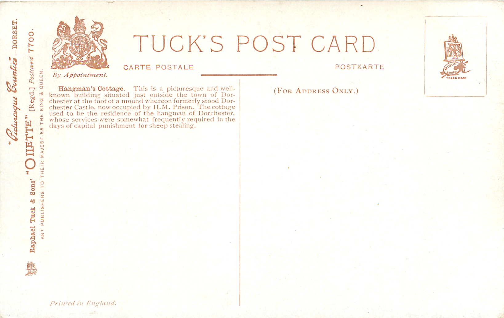 OILETTE, PICTURESQUE COUNTIES on front, PICTURESQUE DORSET on back, PRINTED IN ENGLAND, come oilfacsim but not so trade named, 2 backs, listed in 1908/1909 & 1911/1912 & 1930 Postcard Catalogue