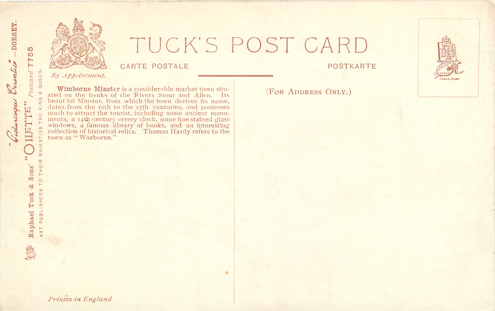 OILETTE, PICTURESQUE COUNTIES, PRINTED IN ENGLAND, come oilfacsim but not so trade named, 2 backs, listed in 1930 POSTCARD Catalogue