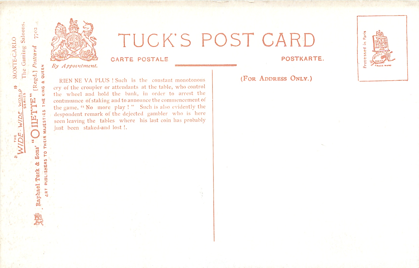 OILETTE, WIDE-WIDE-WORLD, PROCESSED IN PARIS (in stamp box), card titles on back OILETTE, listed in 1908/1909 & 1911/1912 Postcard Catalogue, same images French backs SERIE 937 OILETTE