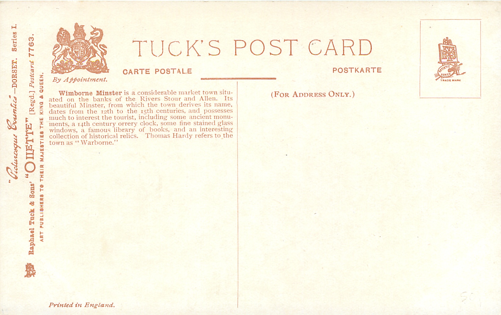 OILETTE, PICTURESQUE COUNTIES on back, PICTURESQUE DORSET on front, PRINTED IN ENGLAND, listed in 1908/1909 & 1911/1912 Postcard Catalogue
