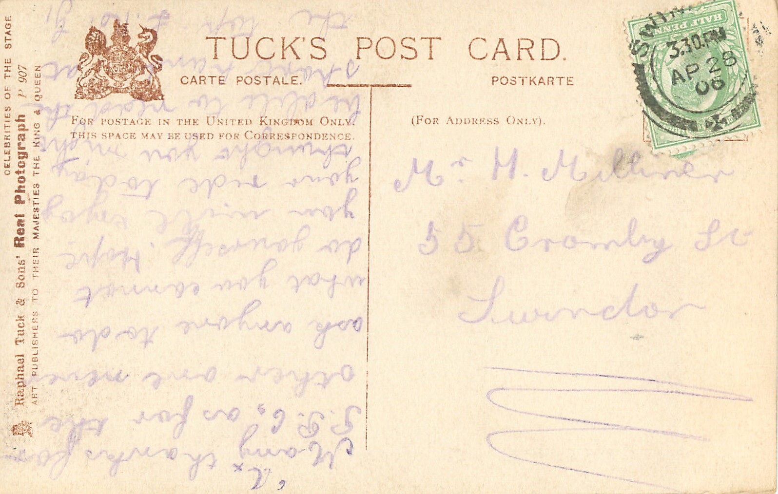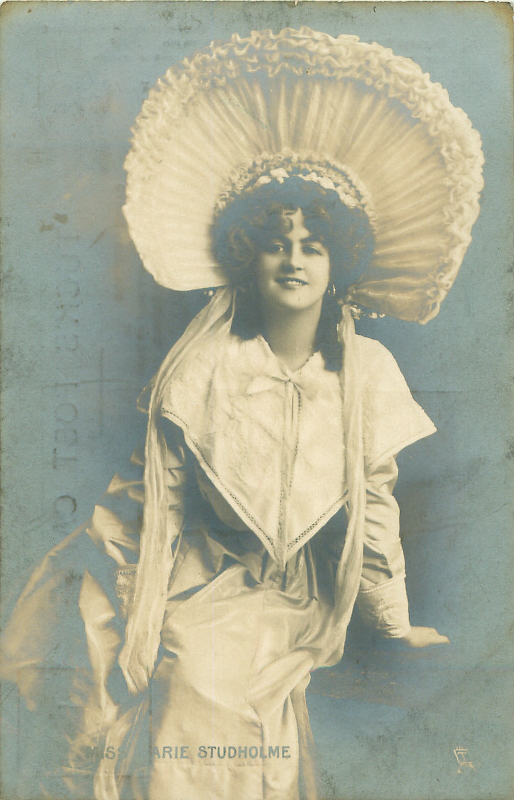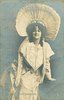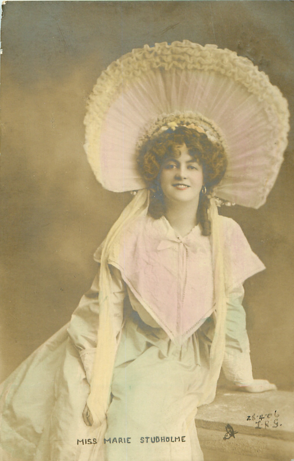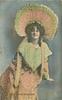 seated on balcony, leans on her left arm, facing & looking front, 3 backs, hand-coloured & beaded, hand-coloured Marie Studholme (1872 Eng.-1930 Eng.) was Miss Molly Seamore in "The Geisha" revival Daly's Th. 1906 (62)