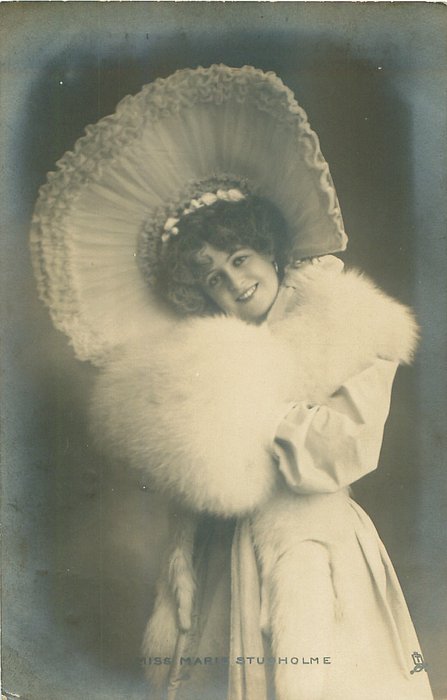 stands facing front, enormous hat & muff, head tilted, looks front , same image G908 Marie Studholme (1872 Eng- 1930 London ) Was Joy Blossom in "My Darling" Hick's Th. London, Musical Play 1907