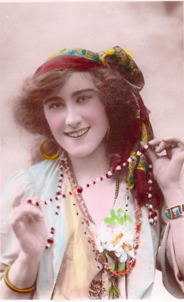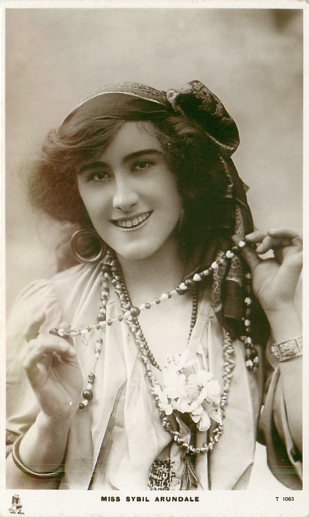 MISS SYBIL ARUNDALE as gypsy, head & chest, holding up string of beaded