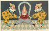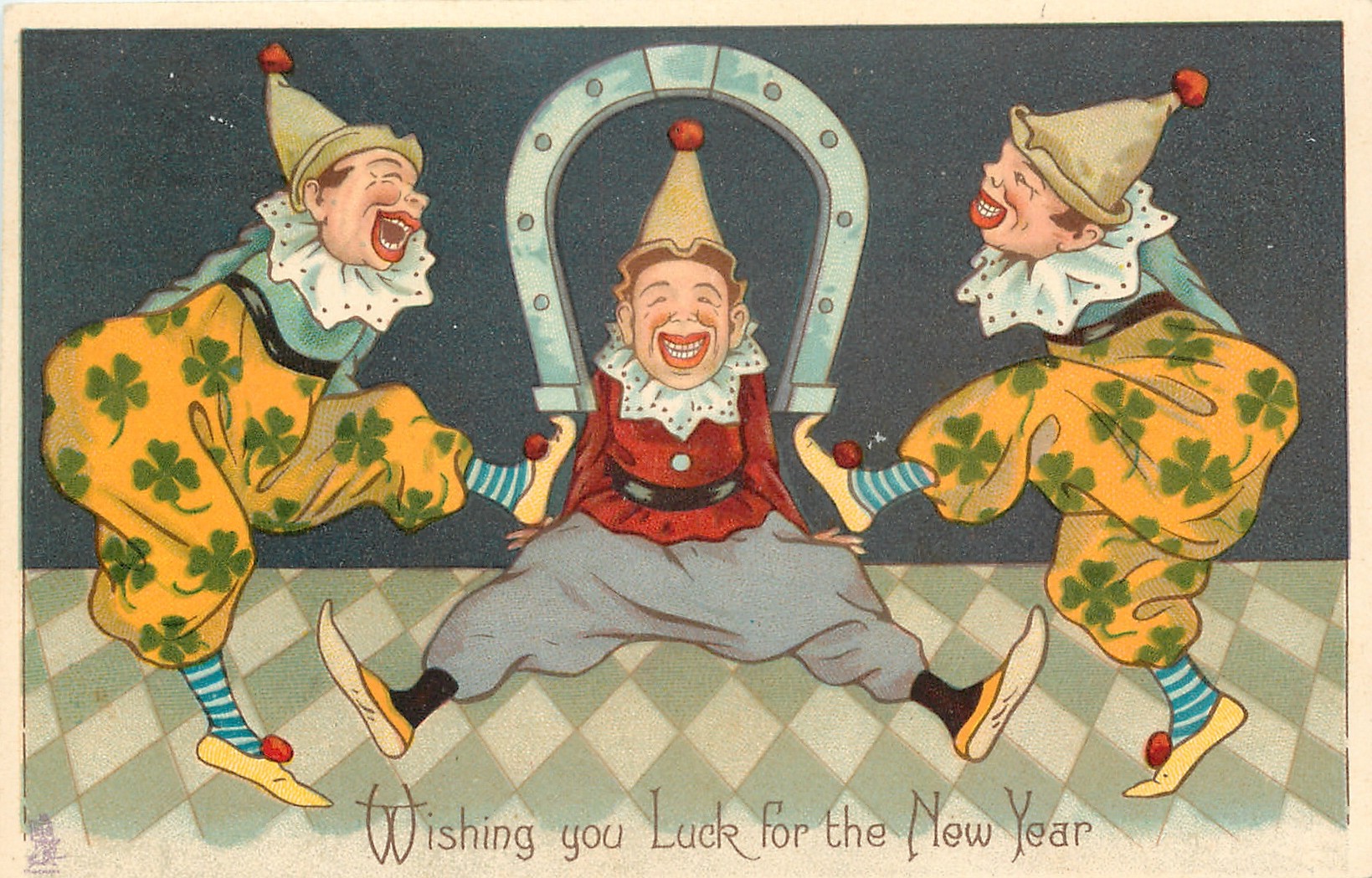 WISHING YOU LUCK FOR THE NEW YEAR three clowns dance with horseshoe