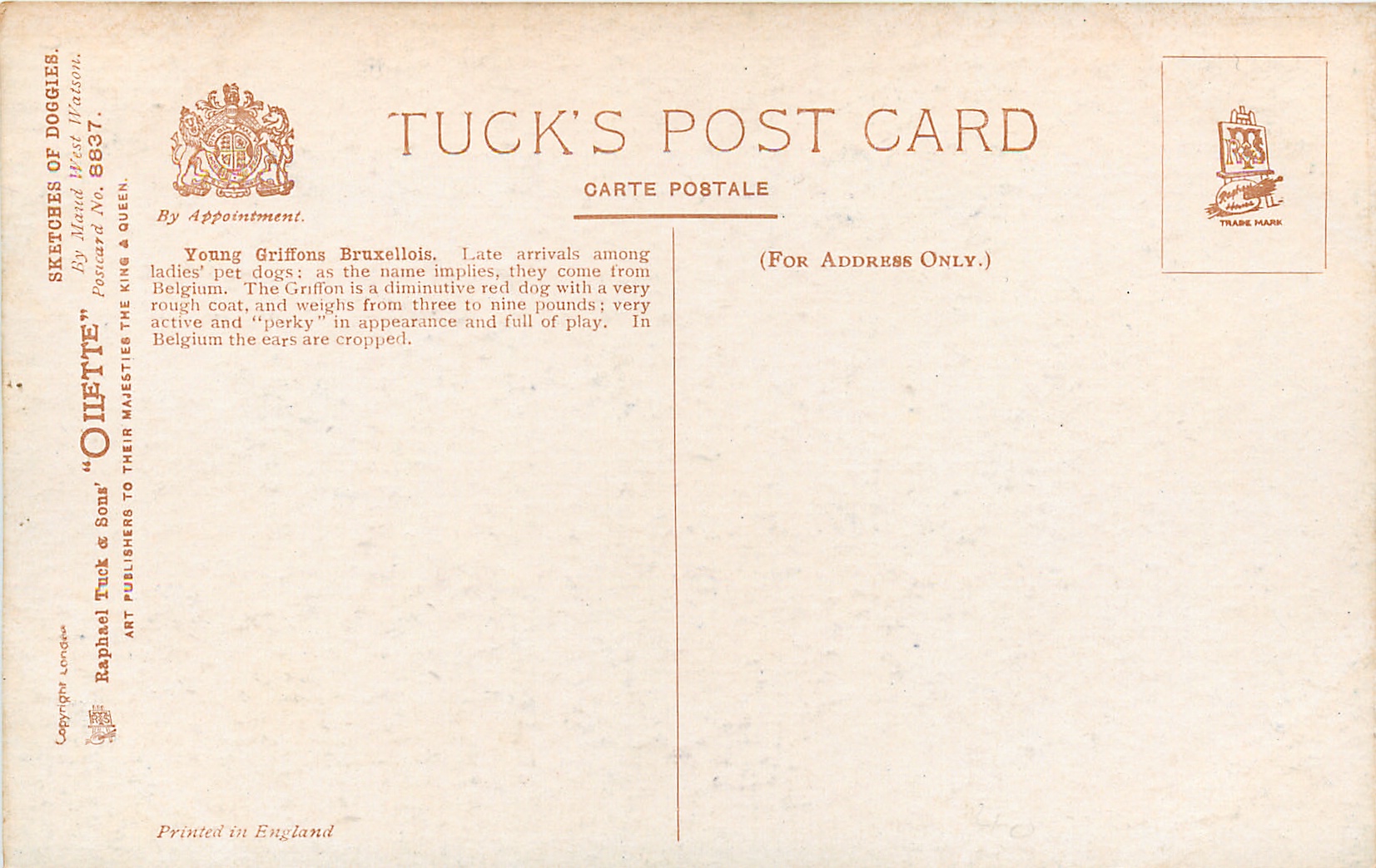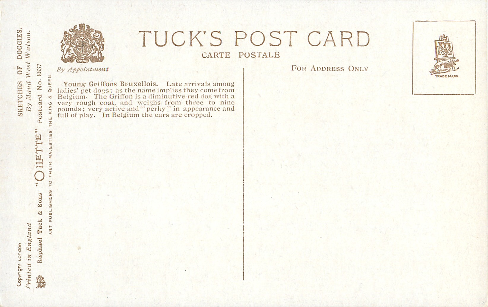 OILETTE, PRINTED IN ENGLAND, COPYRIGHT LONDON, come o/f (but not so trade named), 3 backs, listed in 1926/1927 Postcard Catalogue,