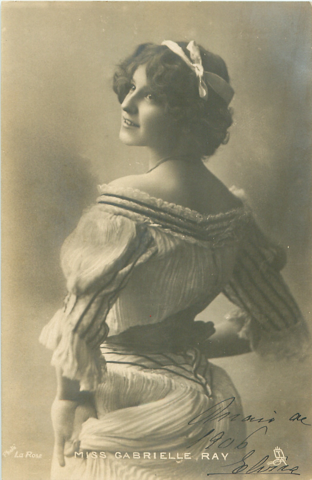 MISS GABRIELLE RAY 3/4 length study, facing awy, looking back over her left shoulder