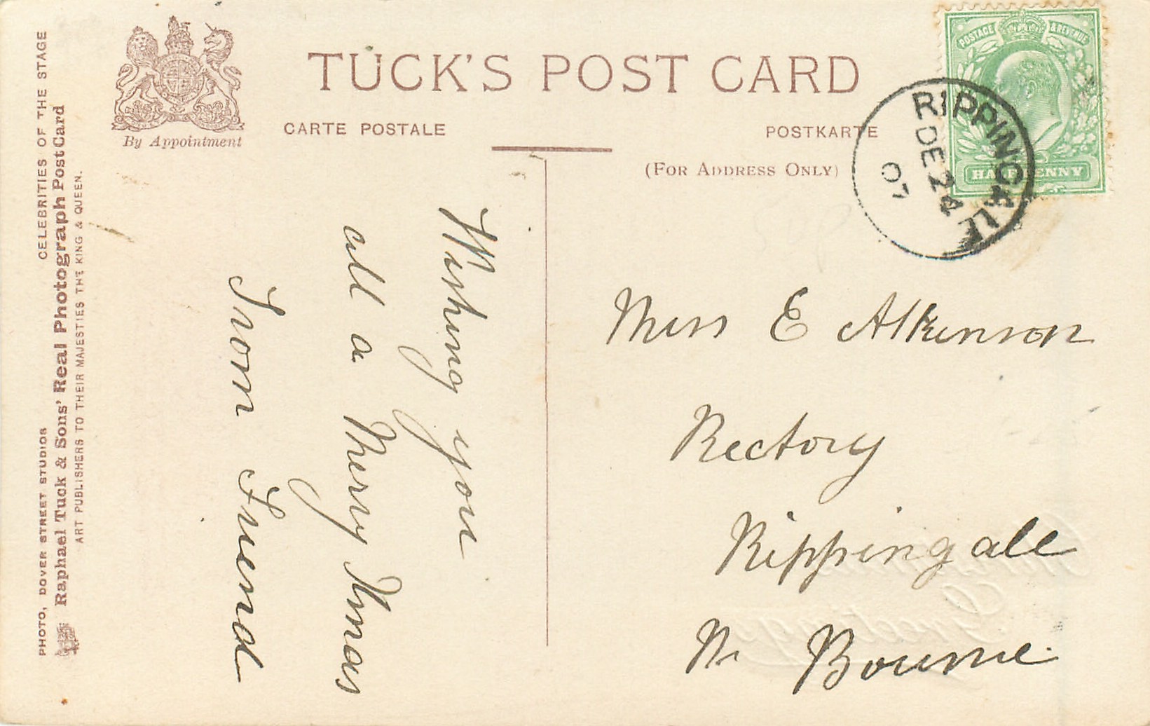 opt. gold A HAPPY CHRISTMAS same image1012, PHOTO DOVER STREET STUDIOS Madge Lessing 1866 London-1932 London) was Dimples in "The Whirl of the Town" New Century Th. London 1901 which became New Adelphi Th.