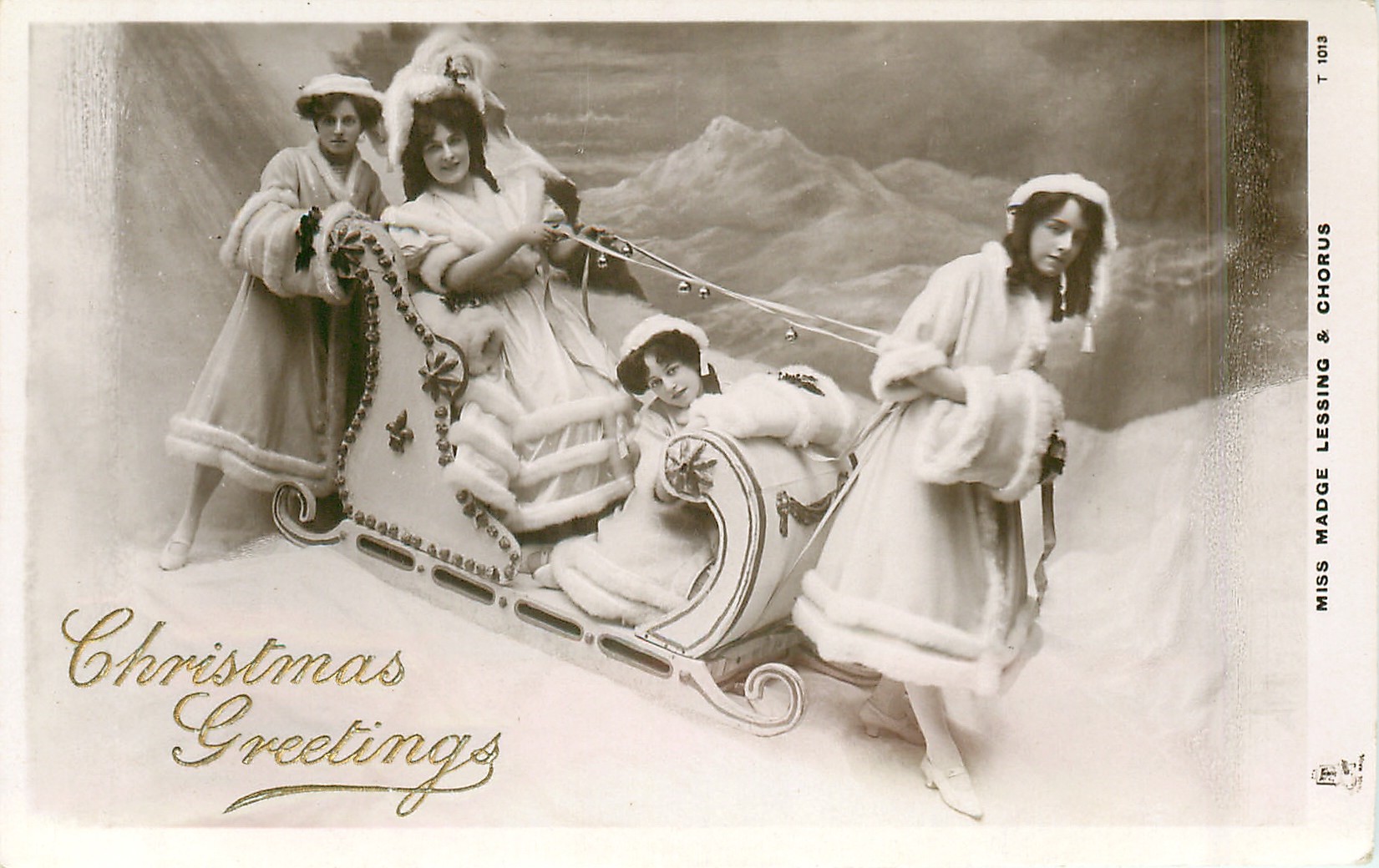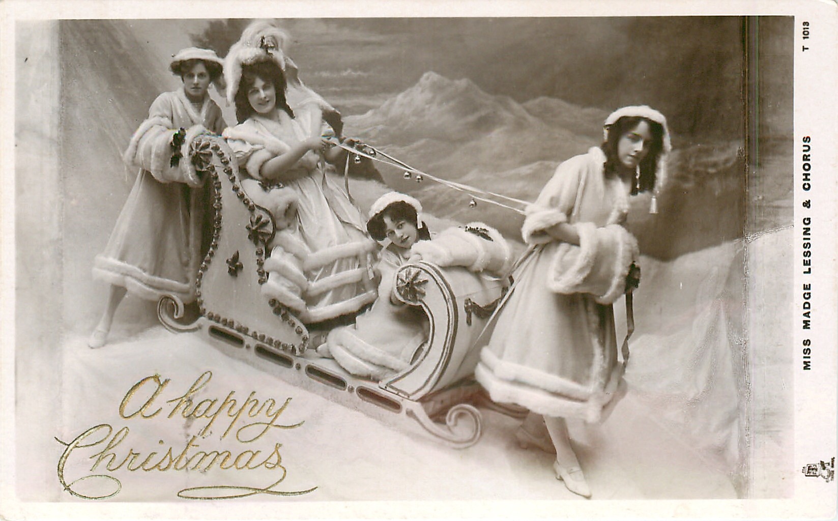 MISS MADGE LESSING & CHORUS snow scene with sled