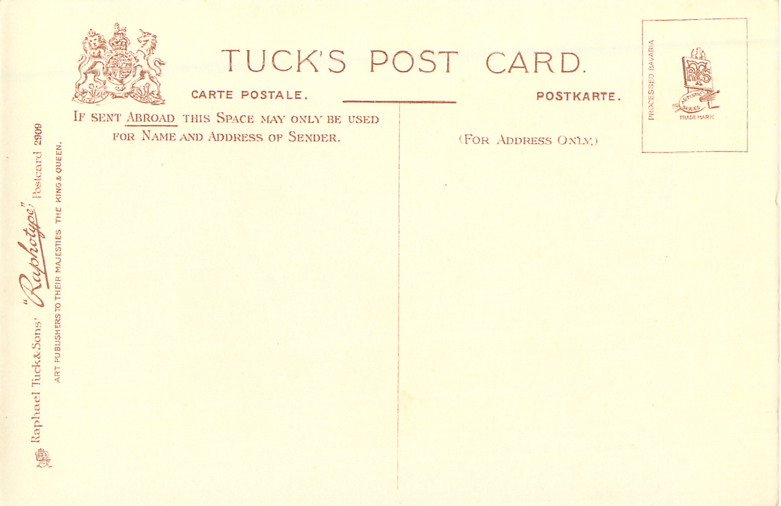 RAPHOTYPE, PROCESSED BAVARIA (in stamp box), artists name comes in black or red, same images RAPHOTYPE green/black 2809, listed in 1904 POSTCARD Catalogue