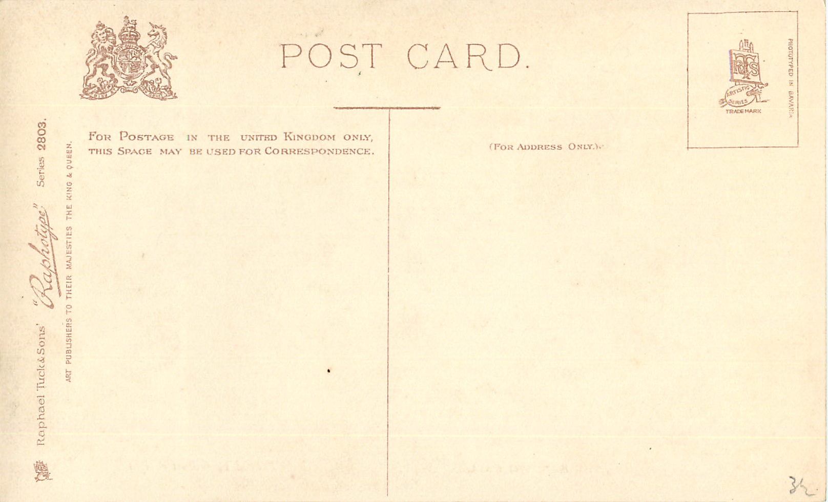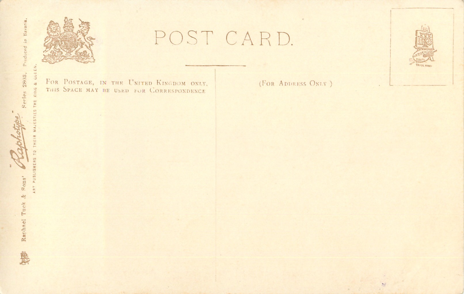 RAPHOTYPE, PRODUCED IN BAVARIA or PHOTOYPED IN BAVARIA (in stamp box), same set in green/black 2903, PAINTED BY J. CHARLTON or GILBERT WRIGHT., listed in 1904 POSTCARD Catalogue