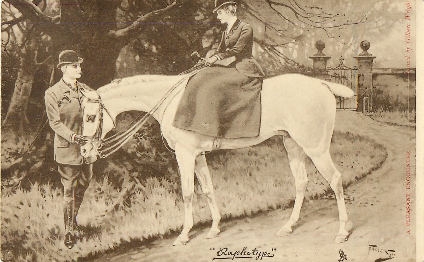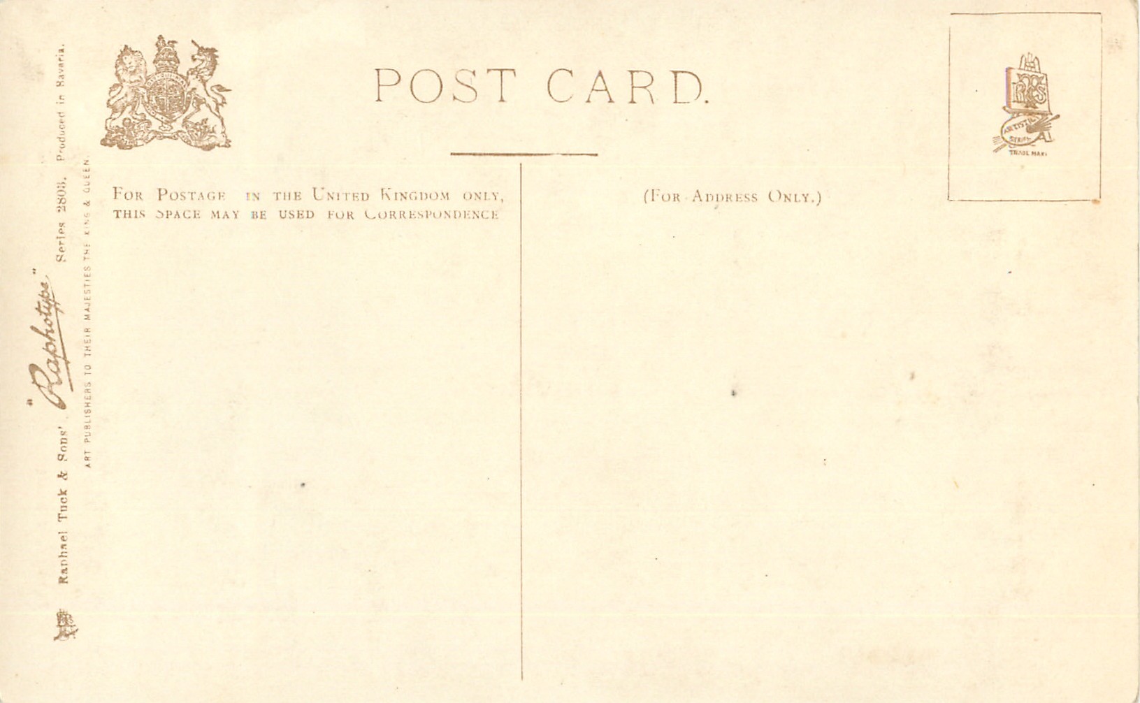 RAPHOTYPE, PRODUCED IN BAVARIA or PHOTOYPED IN BAVARIA (in stamp box), same set in green/black 2903, PAINTED BY J. CHARLTON or GILBERT WRIGHT., listed in 1904 POSTCARD Catalogue