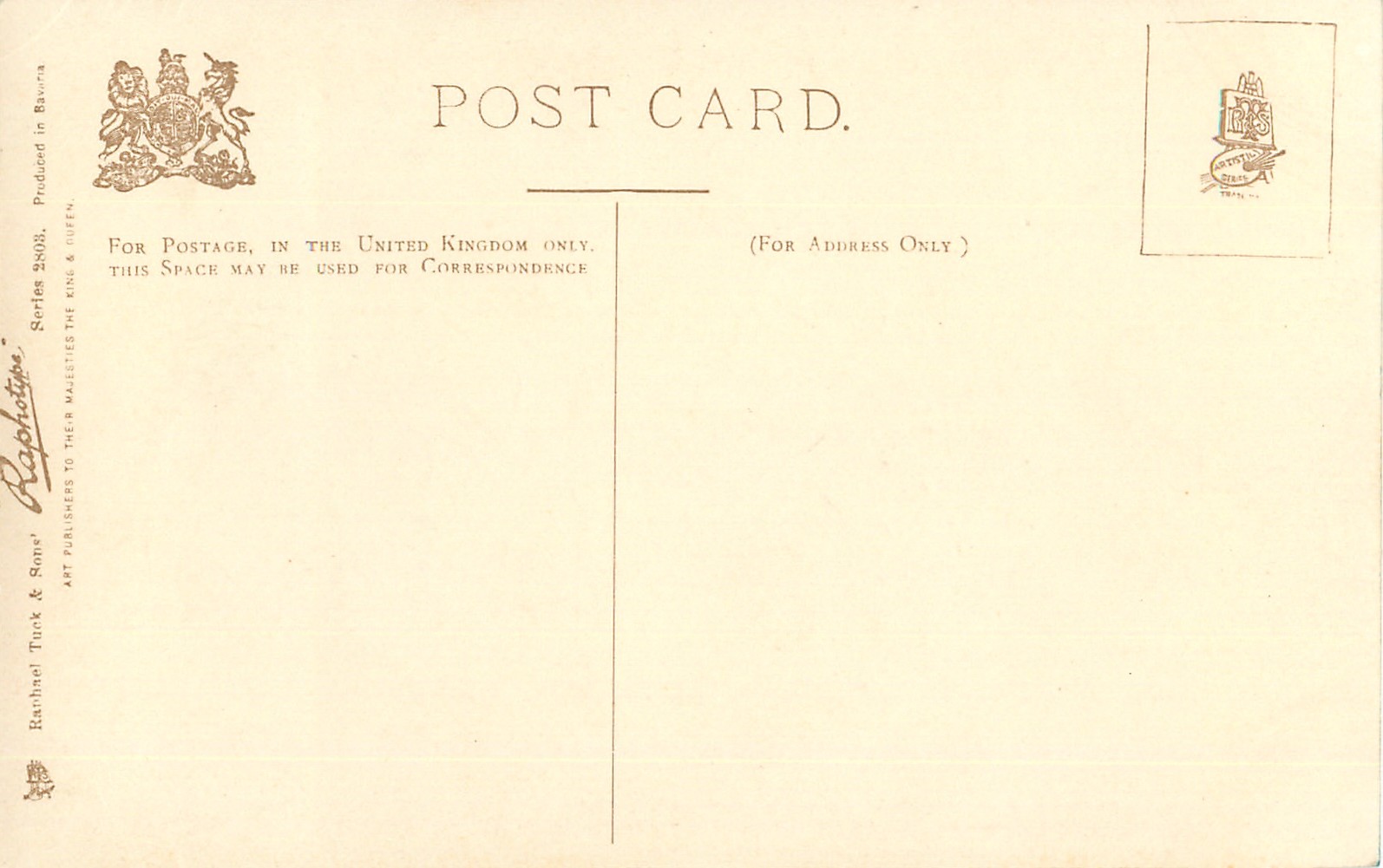 RAPHOTYPE, PRODUCED IN BAVARIA or PHOTOYPED IN BAVARIA (in stamp box), same set in green/black 2903, PAINTED BY J. CHARLTON or GILBERT WRIGHT., listed in 1904 POSTCARD Catalogue