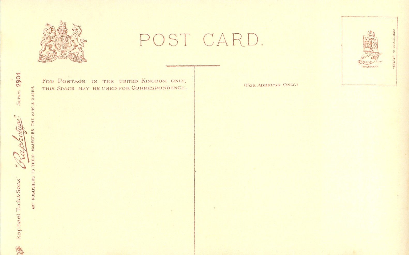 RAPHOTYPE, PHOTOTYPED IN BAVARIA, (in stamp box), card titles in blue or red, same images RAPHOTYPE 2804 in sepia, listed in 1904 POSTCARD Catalogue