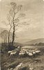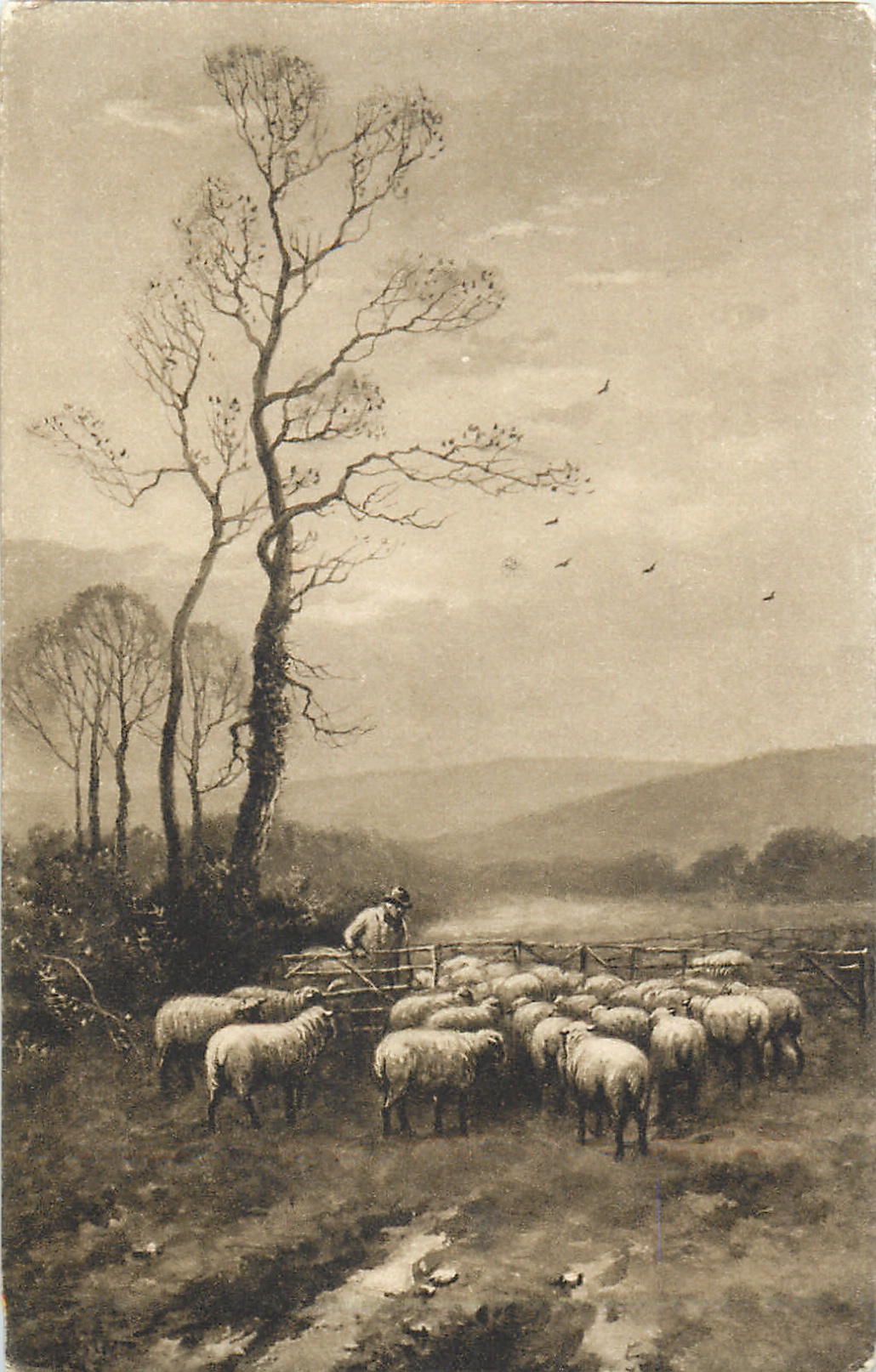 shepherd observes sheep passing through hurdle at base of tall tree left*