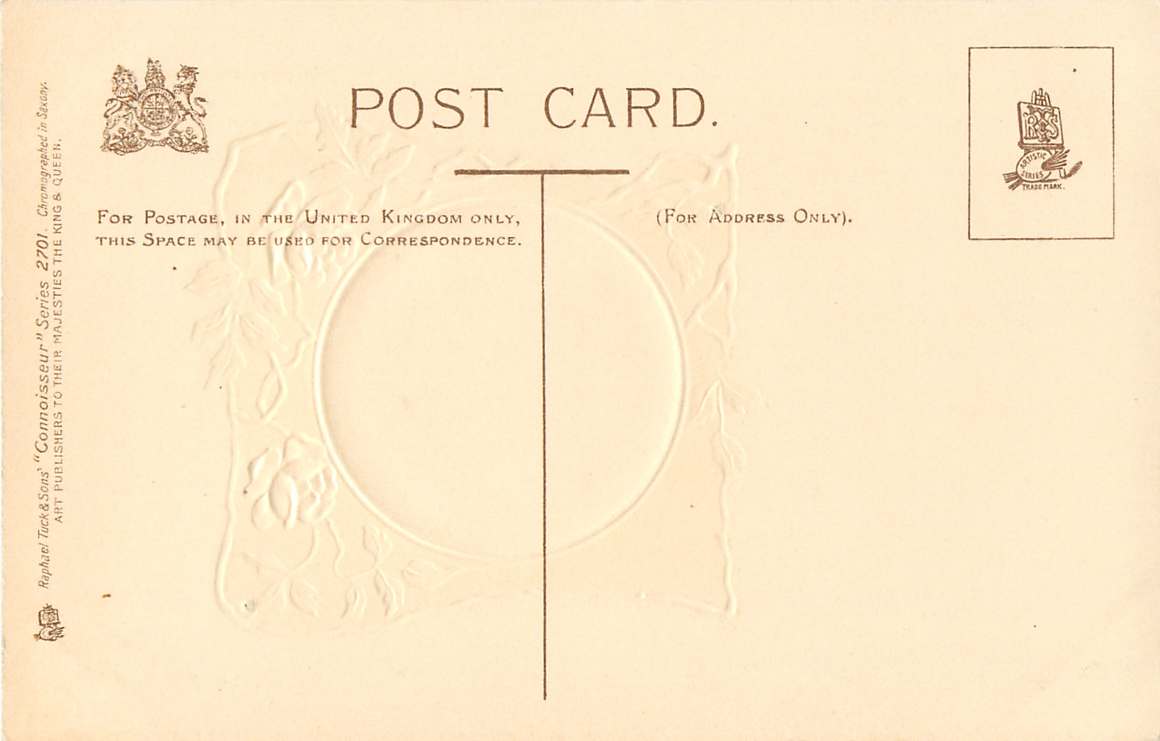 CONNOISSEUR, gilt embossed, CHROMOGRAPHED IN SAXONY, listed in 1908/1909 & 1911/1912 Postcard Catalogue