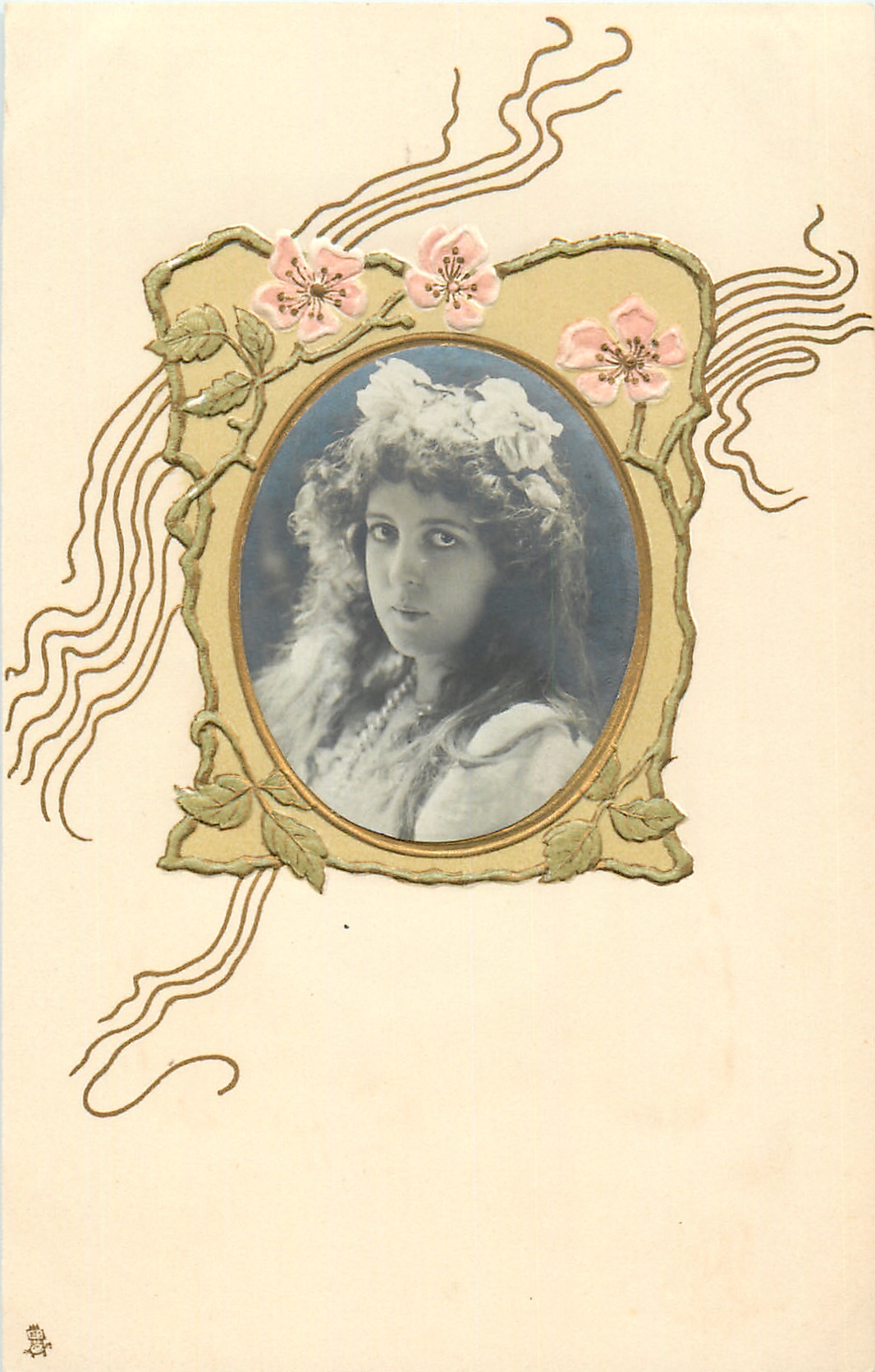 art nouveau design round photographic insert of girl with long hair & flowers in it, facing left, looking front