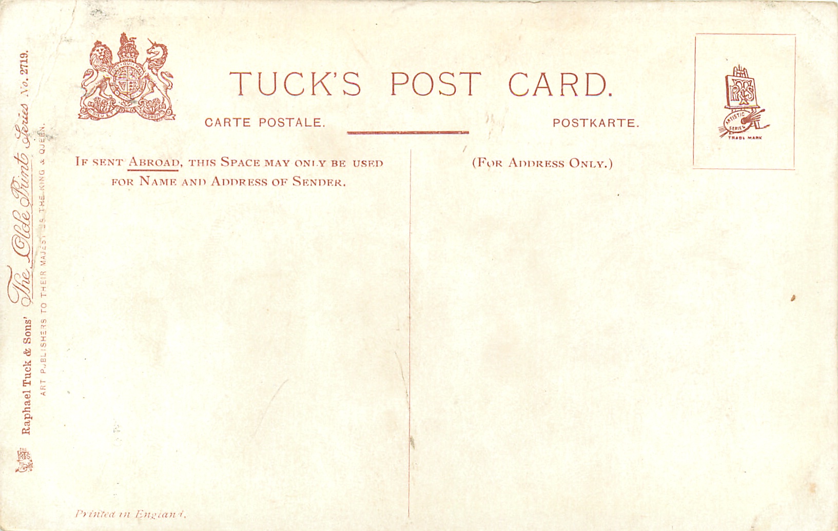 PRINTED IN ENGLAND, listed in 1908/1909 & 1911/1912 Postcard Catalogue
