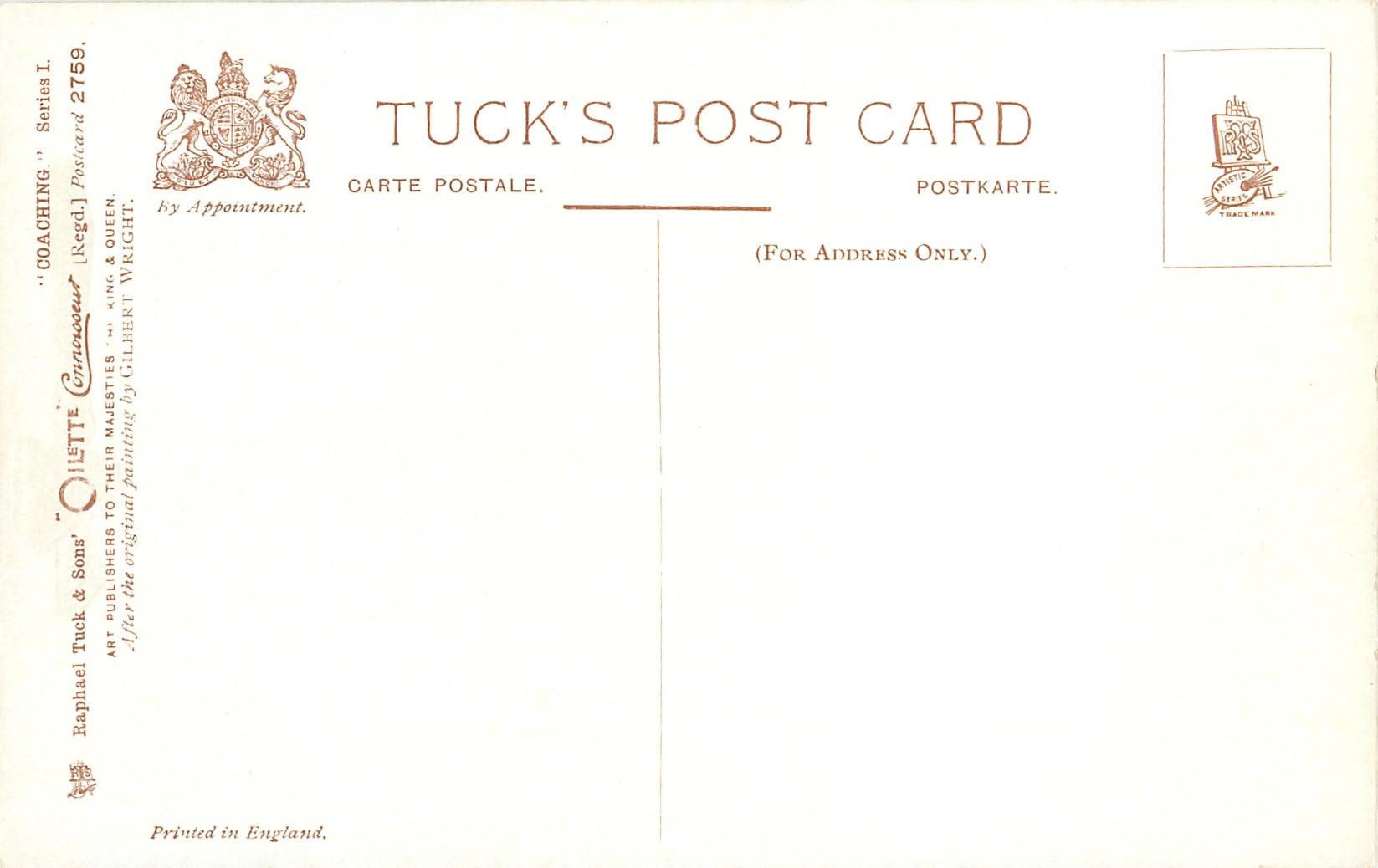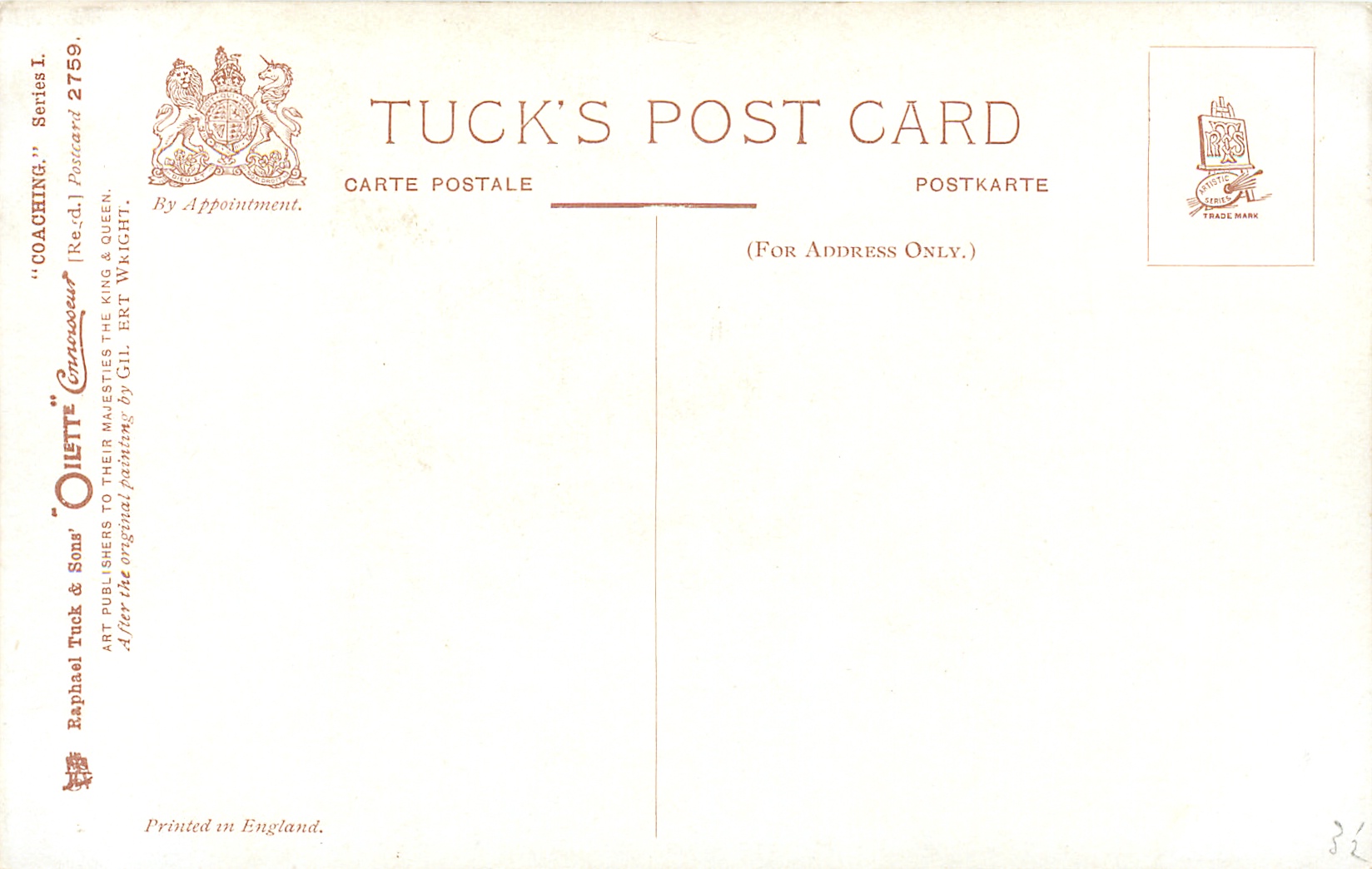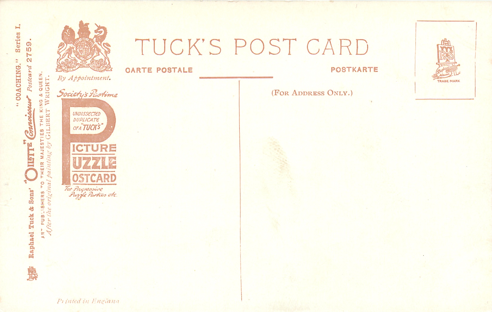 OILETTE CONNOISSEUR, PRINTED IN ENGLAND, 2 backs, listed in 1908/1909 & 1911/1912 Postcard Catalogue, same images 3270, come with Tuck picture puzzle ads on back, AFTER THE ORIGINAL PAINTING BY GILBERT WRIGHT.