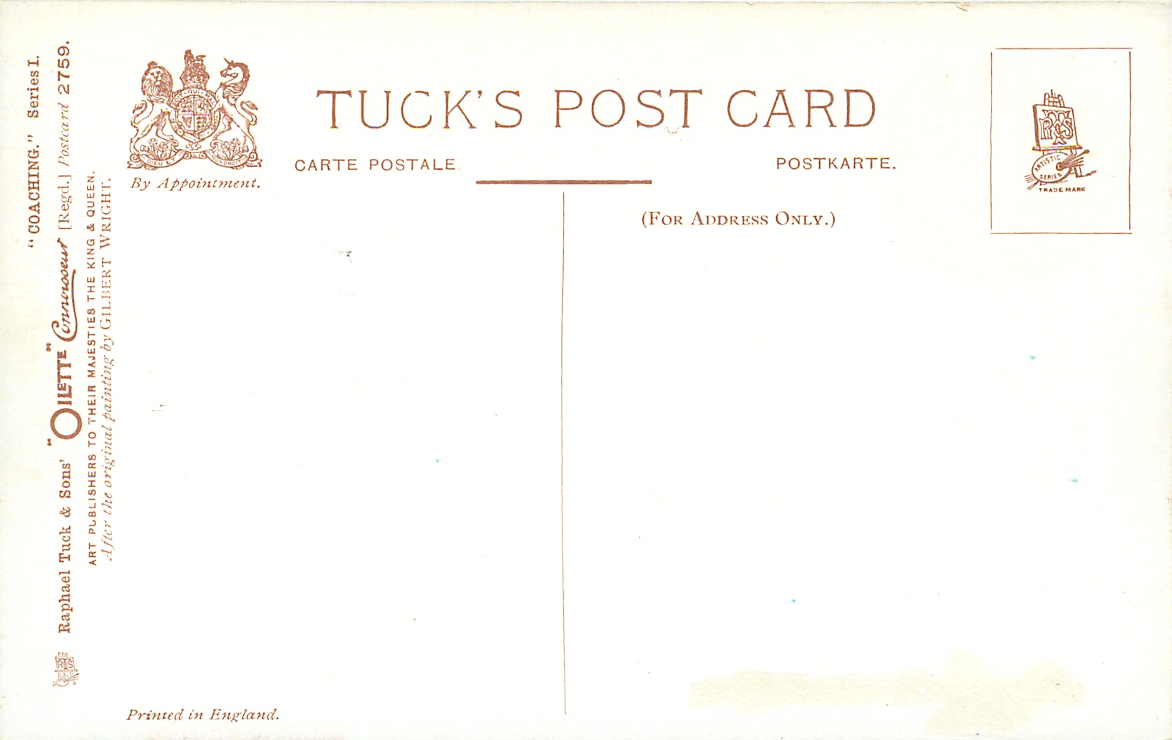 OILETTE CONNOISSEUR, PRINTED IN ENGLAND, 2 backs, listed in 1908/1909 & 1911/1912 Postcard Catalogue, same images 3270, come with Tuck picture puzzle ads on back, AFTER THE ORIGINAL PAINTING BY GILBERT WRIGHT.