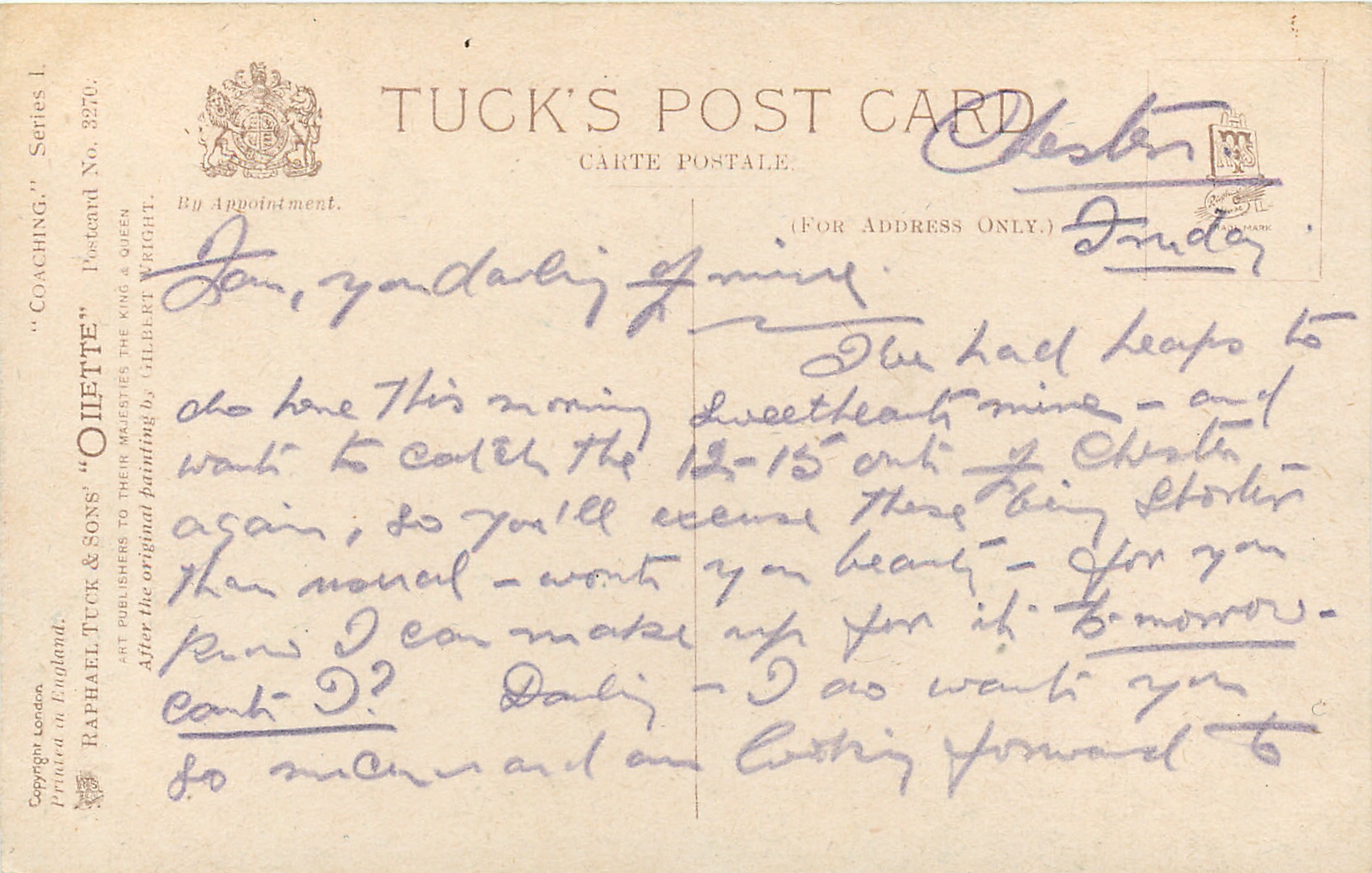 OILETTE, PRINTED IN ENGLAND, COPYRIGHT LONDON, listed in 1926/1927 & 1930 Postcard Catalogues & 1932 ART SERVICE Catalogue, same images OILETTE CONNOISSEUR 2759, come O/F but not so trade named, AFTER THE ORIGINAL PAINTING BY GILBERT WRIGHT.