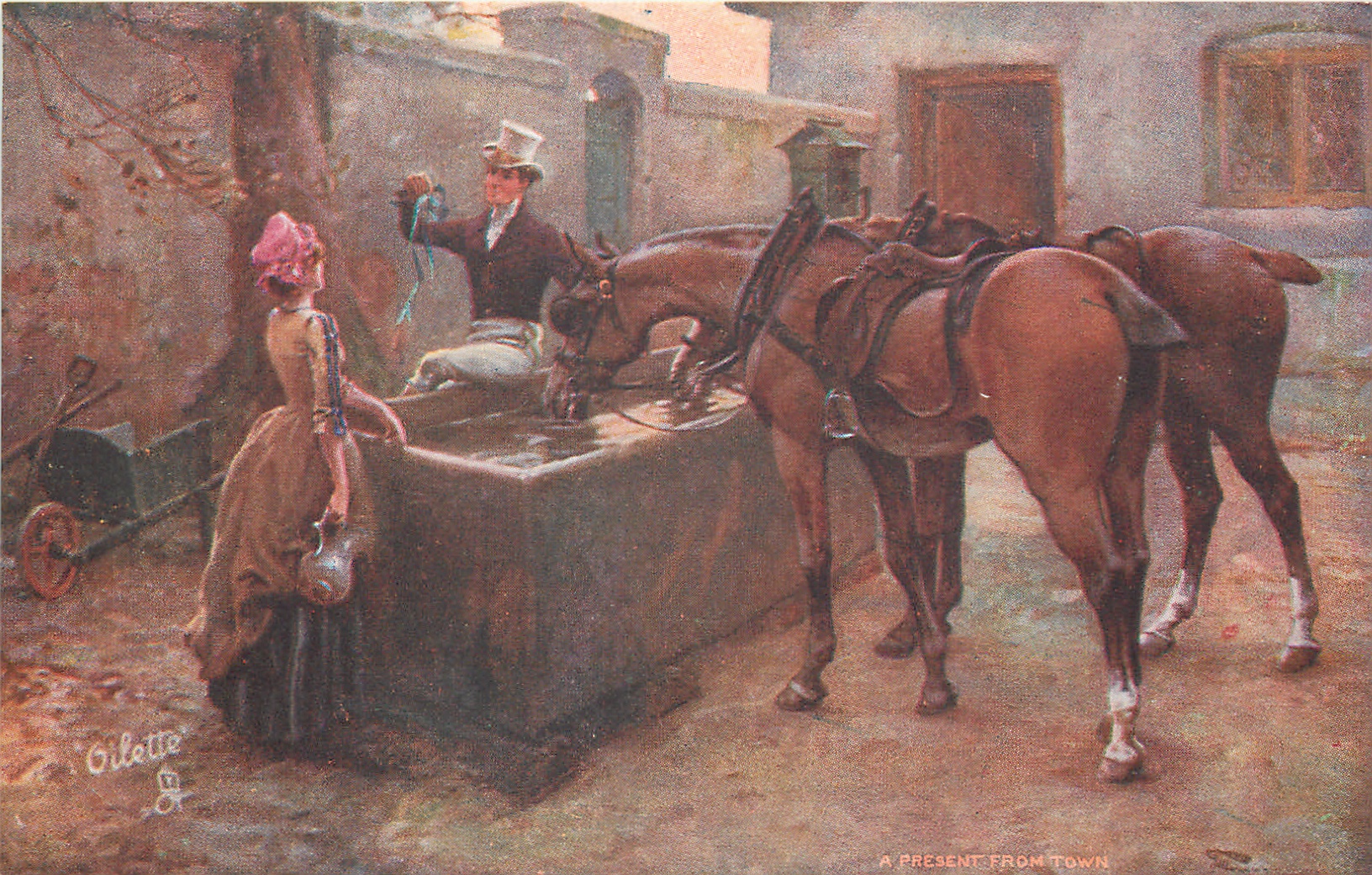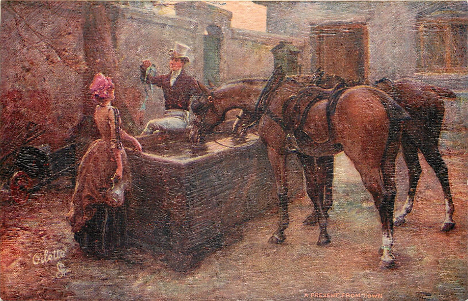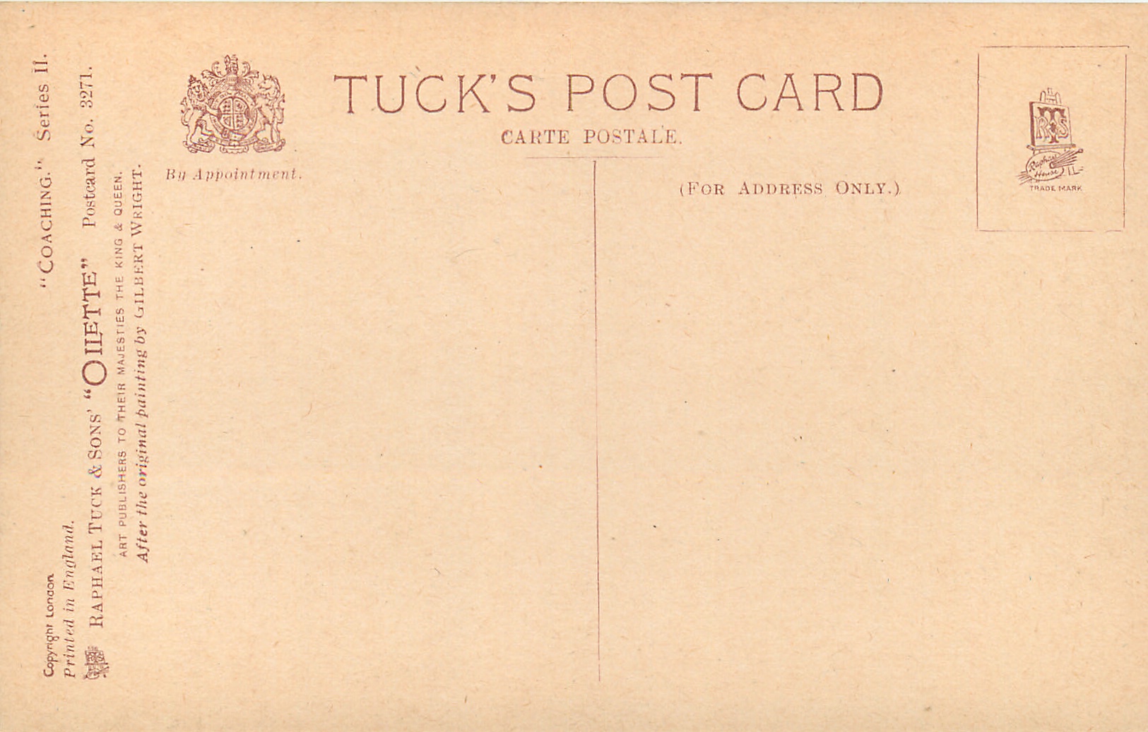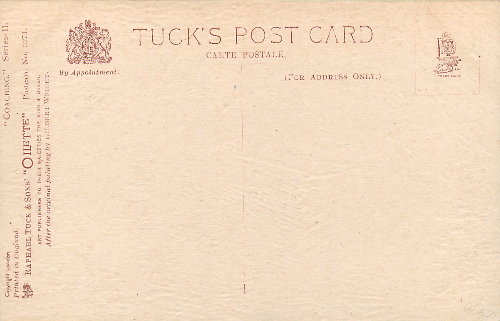OILETTE, PRINTED IN ENGLAND, COPYRIGHT LONDON, listed in 1911/1912 & 1926/1927 & 1930 Postcard Catalogues, same images OILETTE CONNOISSEUR 2760, come O/F but not so trade named, AFTER THE ORIGINAL PAINTING BY GILBERT WRIGHT.