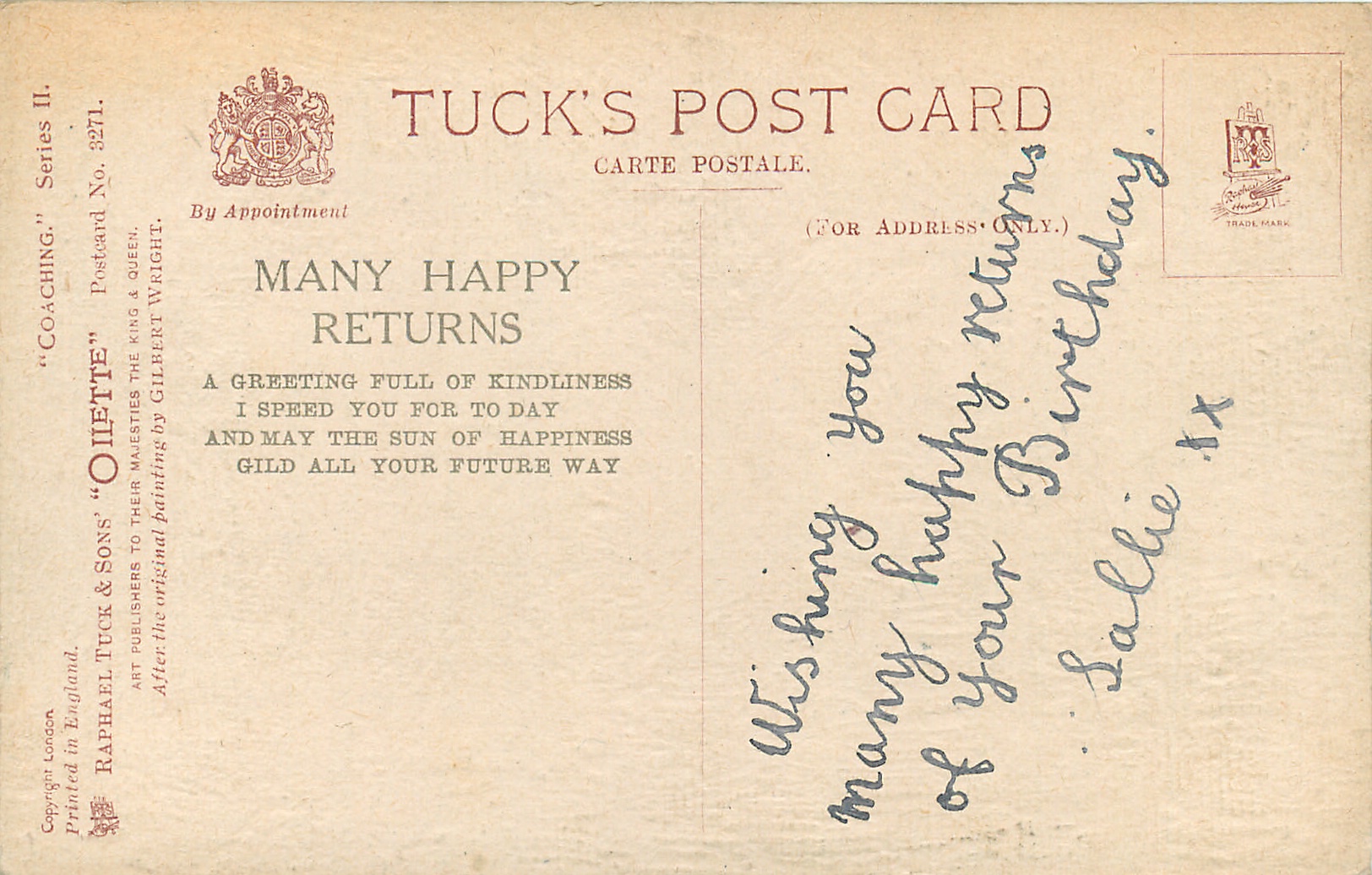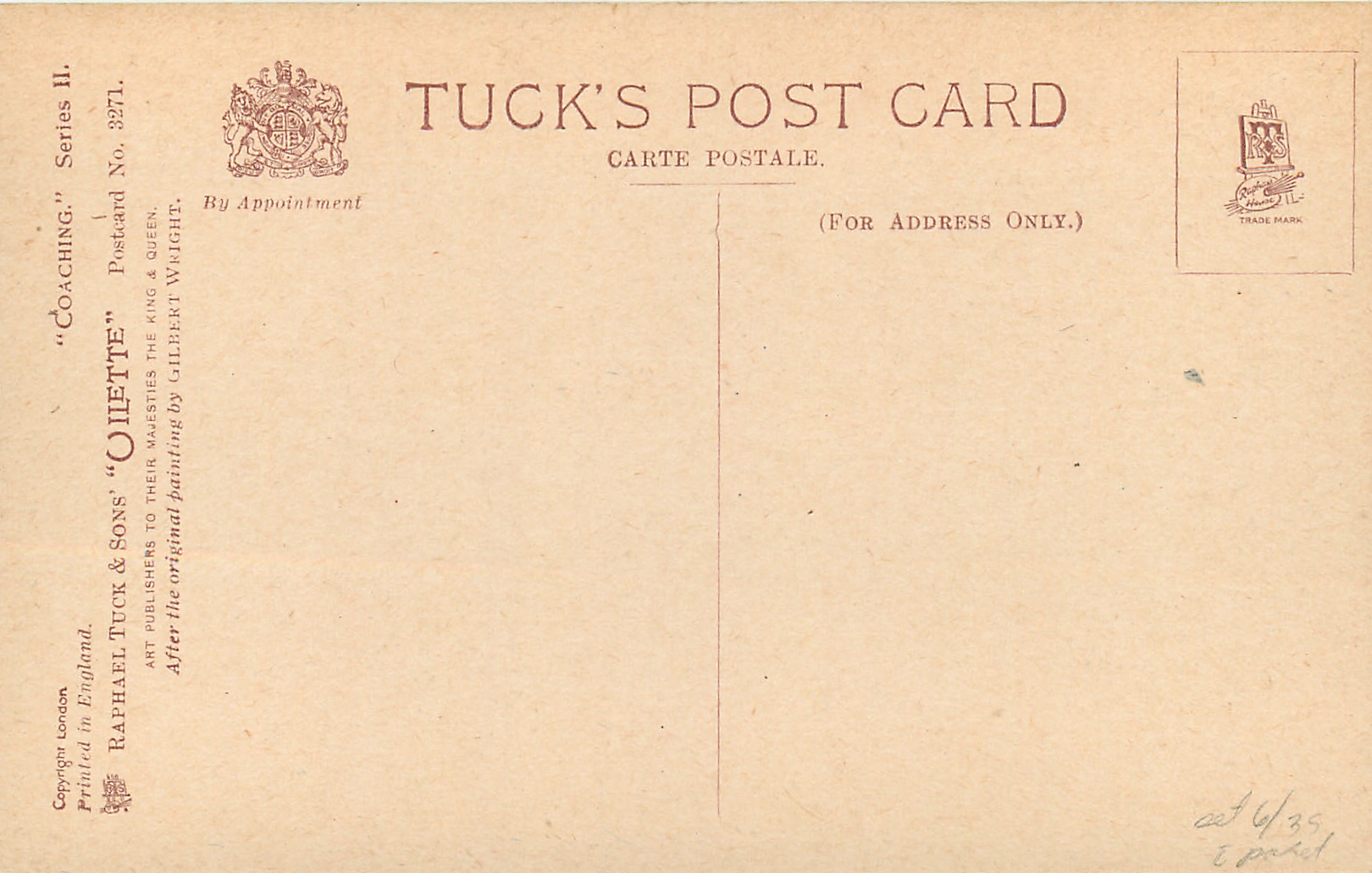 OILETTE, PRINTED IN ENGLAND, COPYRIGHT LONDON, listed in 1911/1912 & 1926/1927 & 1930 Postcard Catalogues, same images OILETTE CONNOISSEUR 2760, come O/F but not so trade named, AFTER THE ORIGINAL PAINTING BY GILBERT WRIGHT.