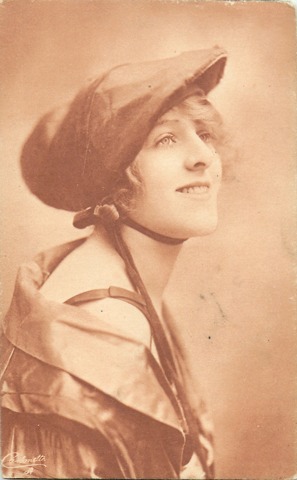 head & shoulders of woman wearing cap secured by ribbons round her neck, faces right, looking up