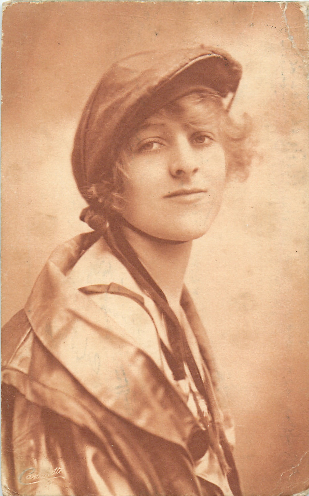 head & shoulders of woman wearing cap secured by ribbons round her neck, faces right, looking front