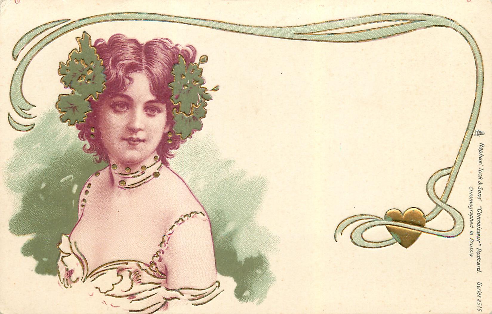 lady with green flowers in hair facing left, looking front, green/white background, floating heart far right