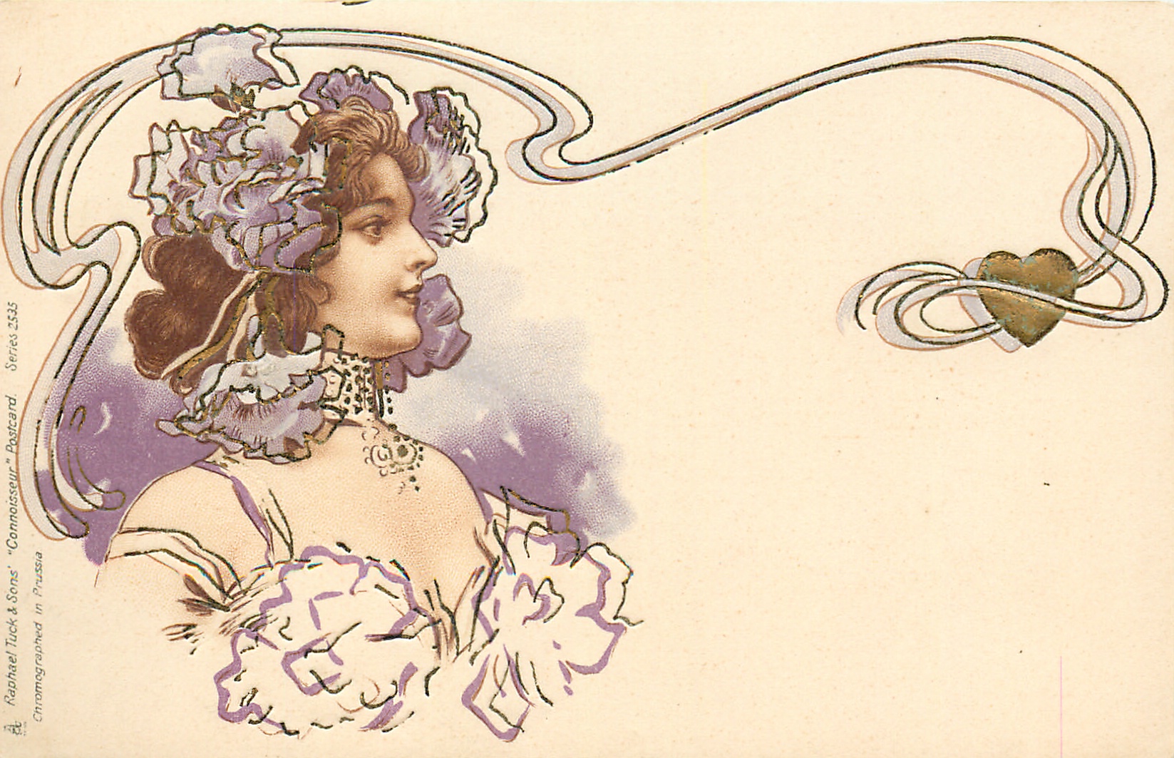 lady with purple flowers in hair facing right, purple/white background, floating heart far right