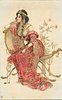 lady sitting on elaborate seat, in red dress, chin on hand, looking left