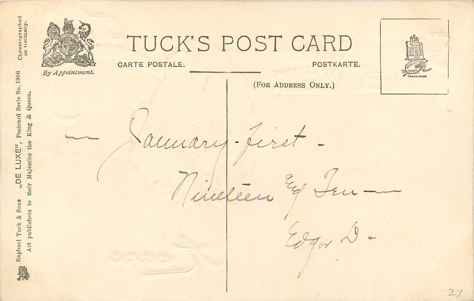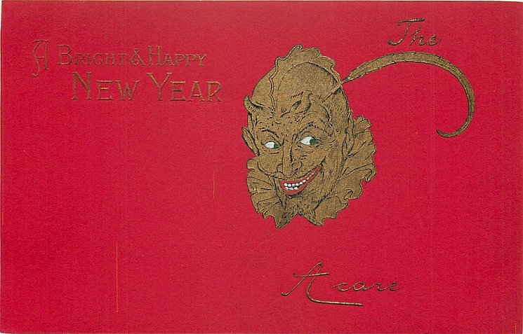 A BRIGHT & HAPPY NEW YEAR devil to right centre, red background