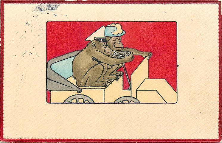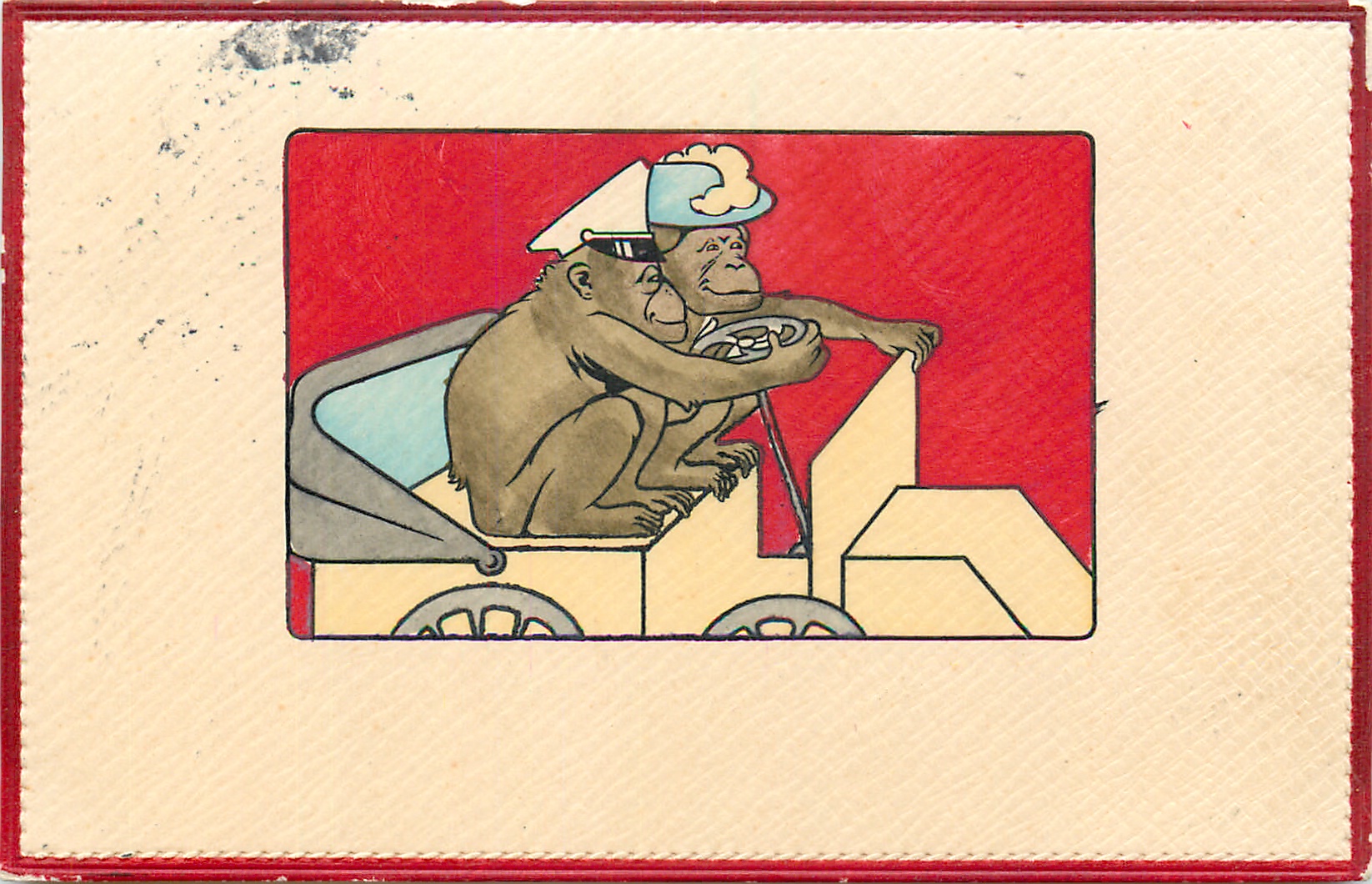 inset monkey in chauffer's cap drives car right, monkey lady in lue hat sits next to him, cream background with red surround