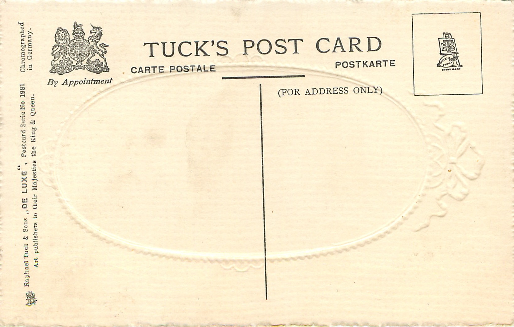 embossed, CHROMOGRAPHED IN GERMANY, all come opt. in red A HAPPY NEW YEAR at base, listed in RAPHAEL TUCK & SONS' LD. CHRISTMAS & NEW YEAR 1904/1905 catalogue