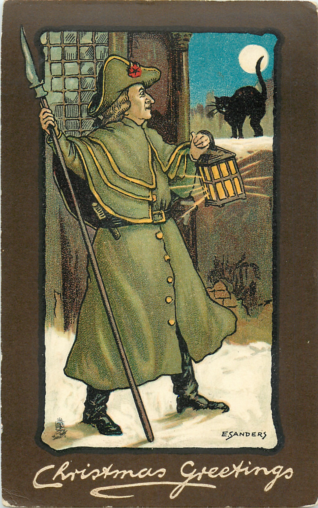 CHRISTMAS GREETINGS night-watchman with light, cat in moon-lit window