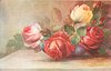 bowl right with four open roses, many buds, no petals on table, signature lower right