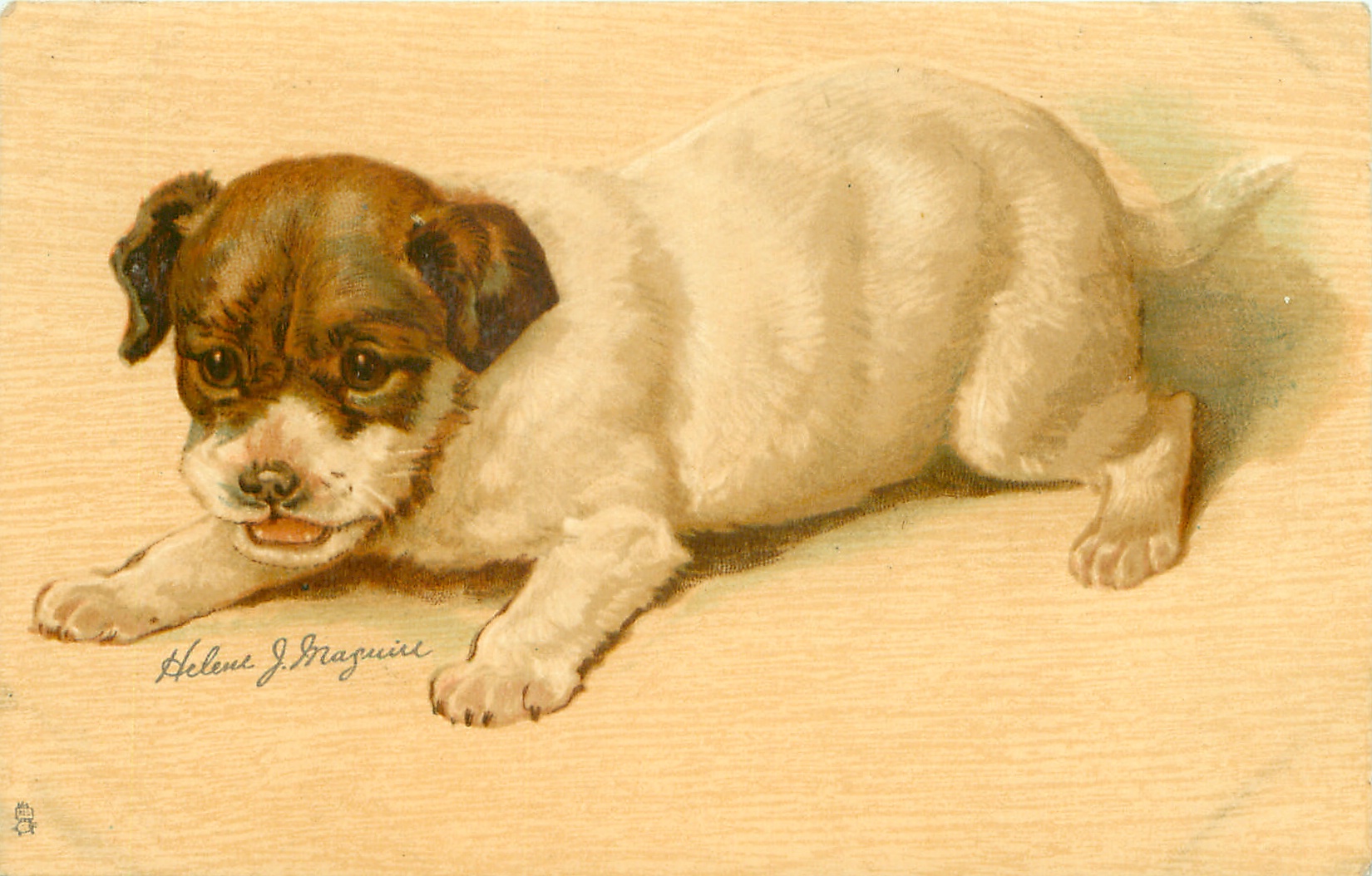 white puppy with brown head, white muzzle, crouches facing left