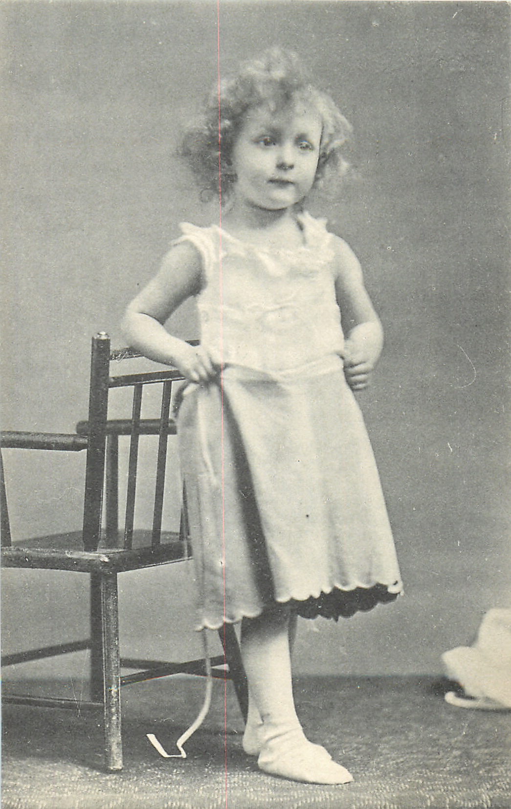 studio pose of small girl standing with back to a wooden chair, hands holding ribbon