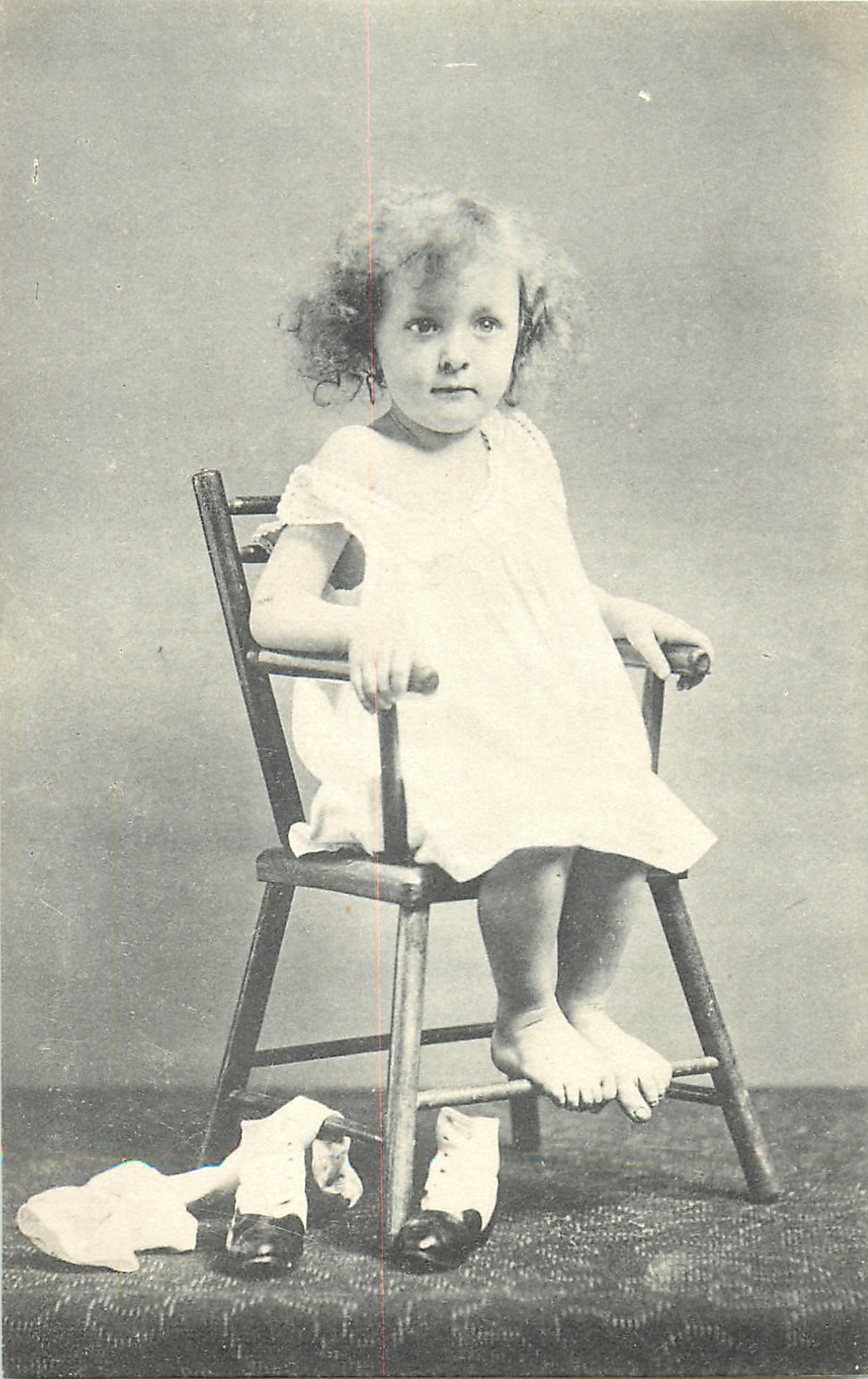 studio pose of small girl sitting in wooden chair, she has taken off both shoes & stockings