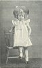 studio pose of small girl on arm of wooden chair, has large hat, holds chair back with her right hand