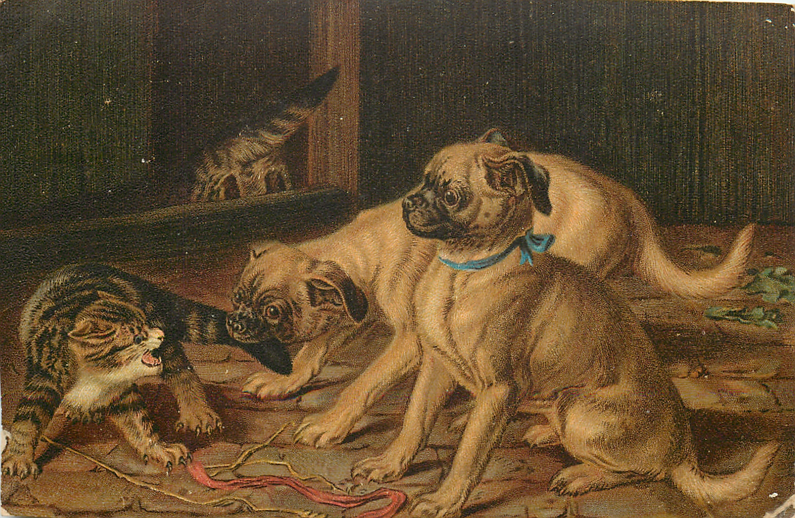 two pugs, one has protesting cats tail in its mouth
