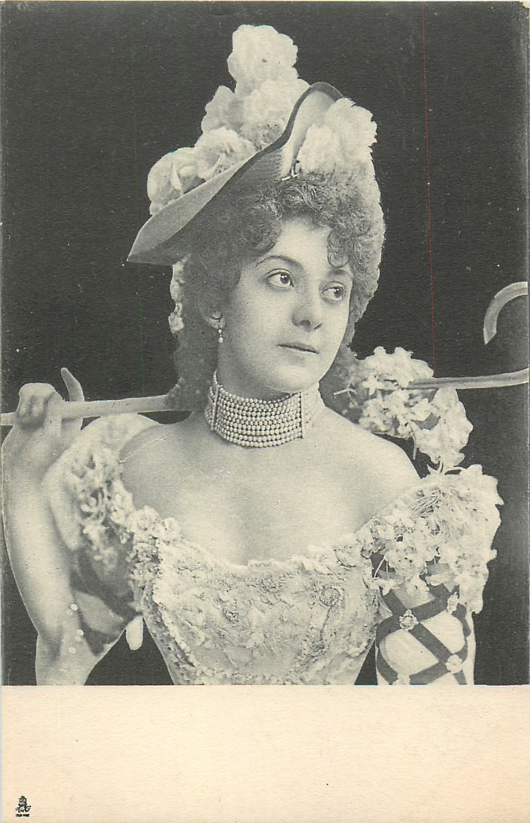 girl in pearl choker holds walking stck behind neck with her right hand