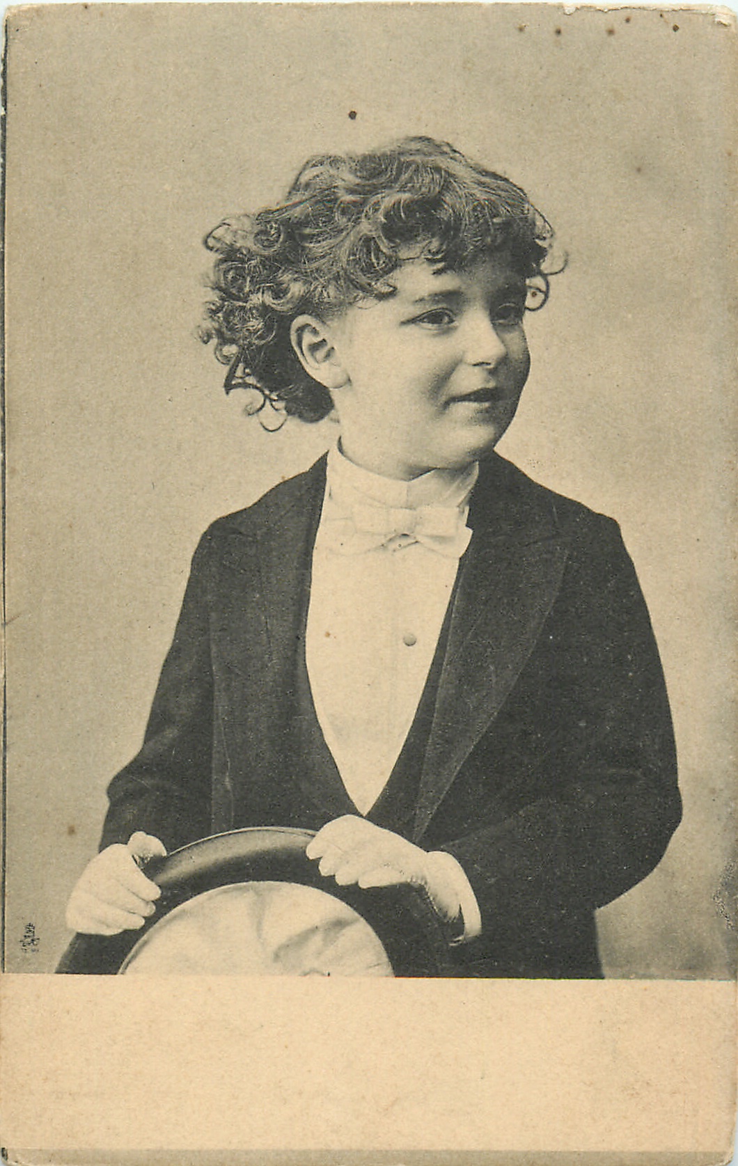 ART, shades of black/white, come hand-coloured, PHOTOTYPED IN BERLIN, young boy in evening dress, listed in 1904 POSTCARD Catalogue