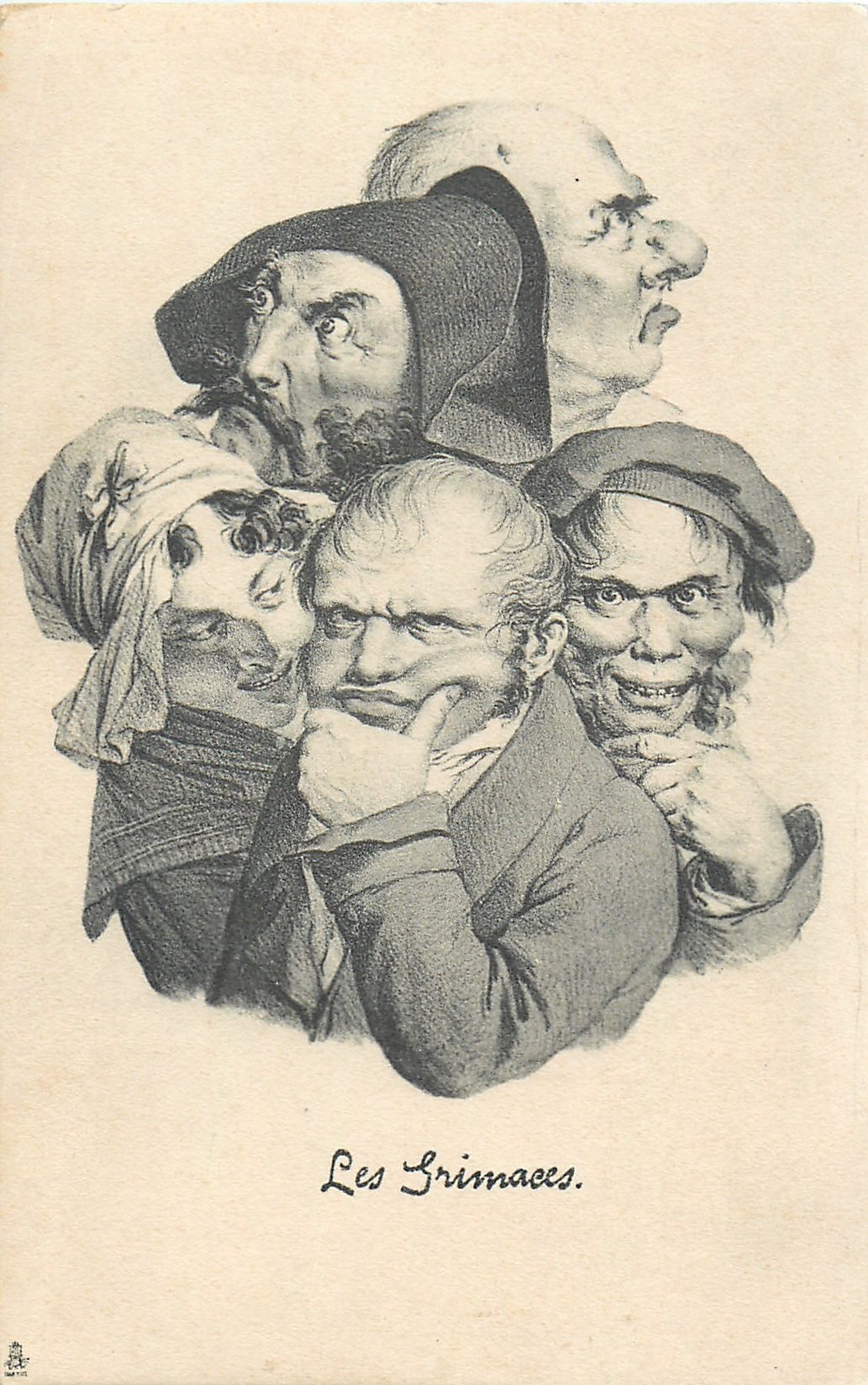 head & shoulder study of four men & a woman all with peculiar expressions, man in front holds chin with his left hand