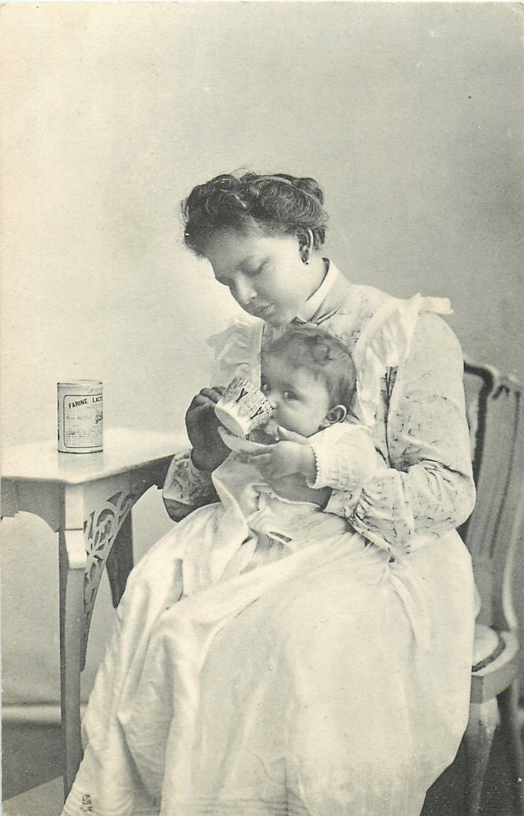 mother with chilld on lap, child holds saucer as mother holds cup for him to drink