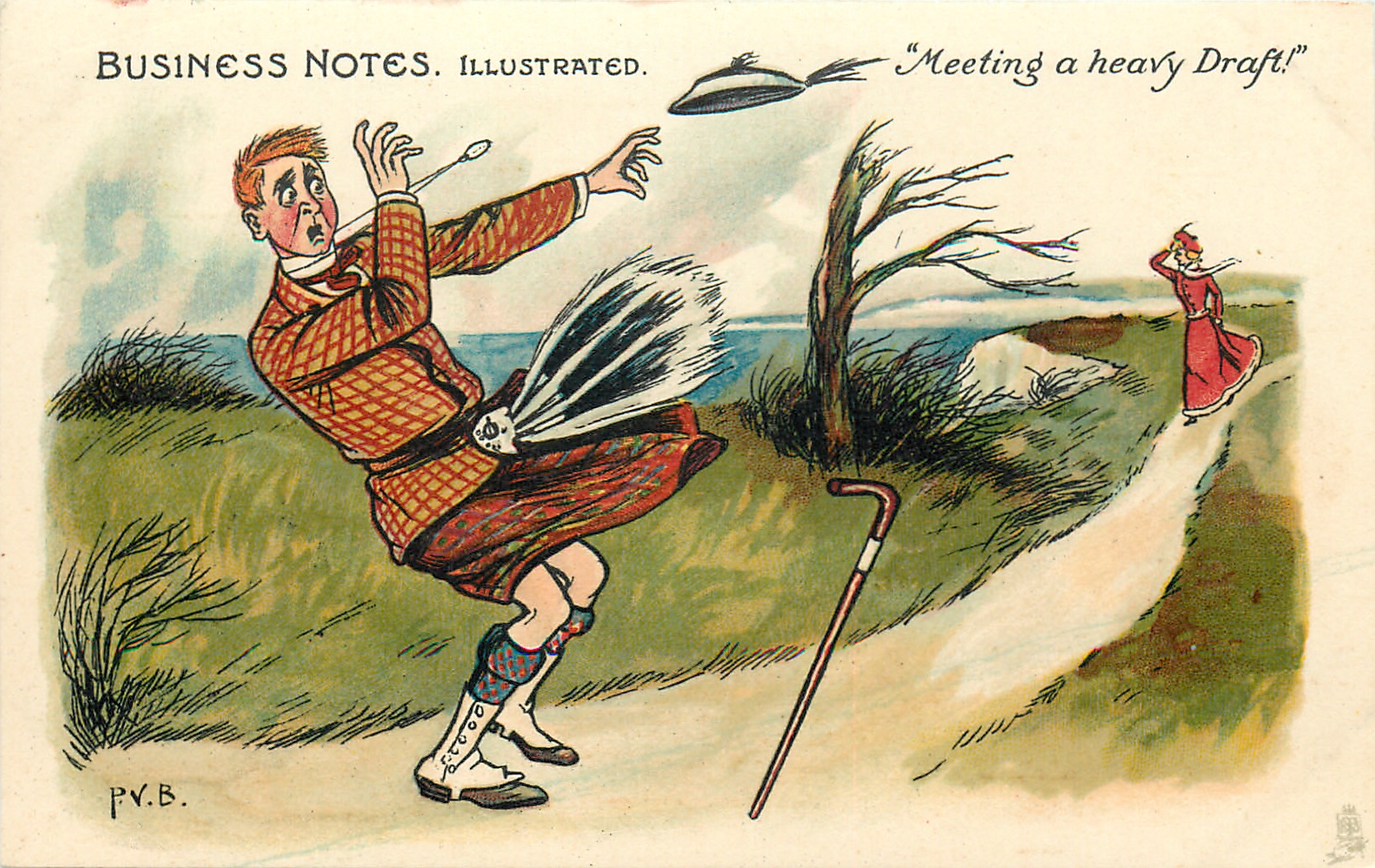 "MEETING A HEAVY DRAFT!" wind blows scotsman's kilt as woman approaches
