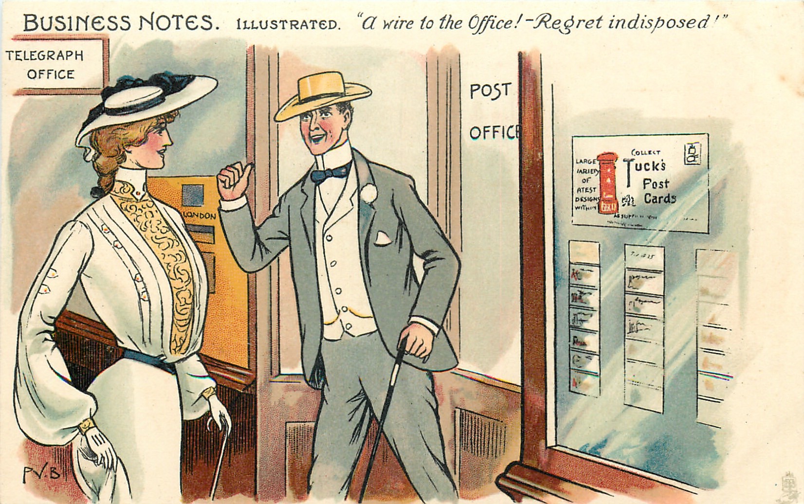 "A WIRE TO THE OFFICE!- REGRET INDISPOSED!" man taking off with pretty girl at post office
