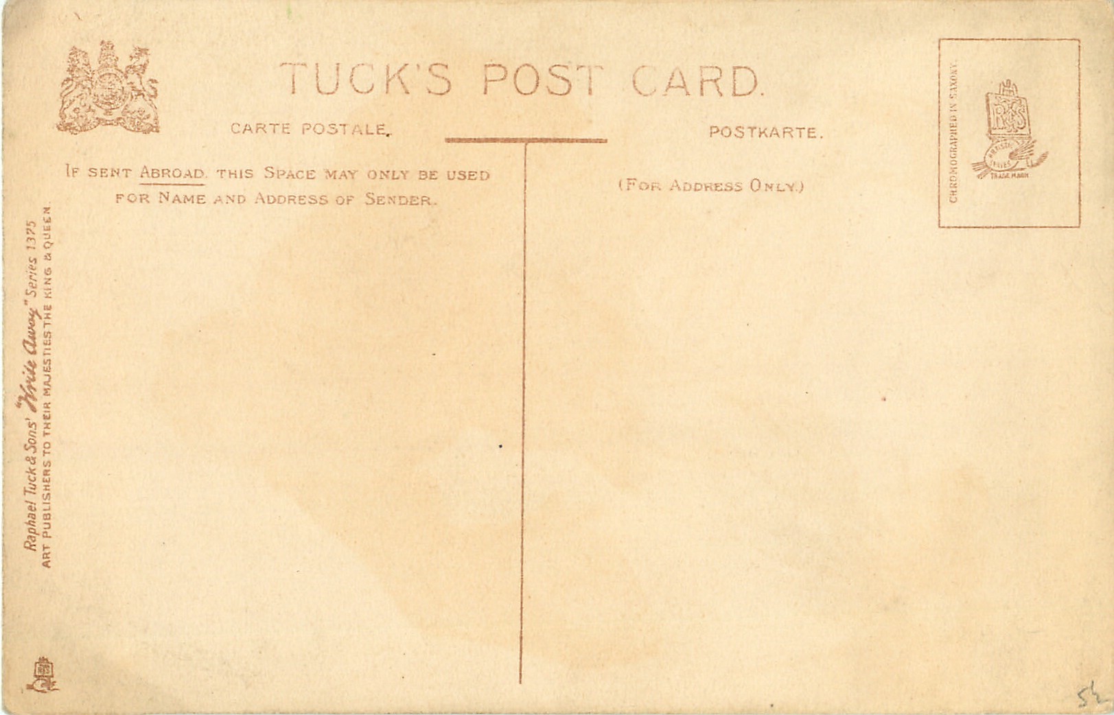 WRITE AWAY, CHROMOGRAPHED IN SAXONY (in stamp box or not), listed as WRITE AWAY in 1904 & 1908/1909 & 1912 & 1911/1912 Postcard Catalogues, same images French backs SERIE 616