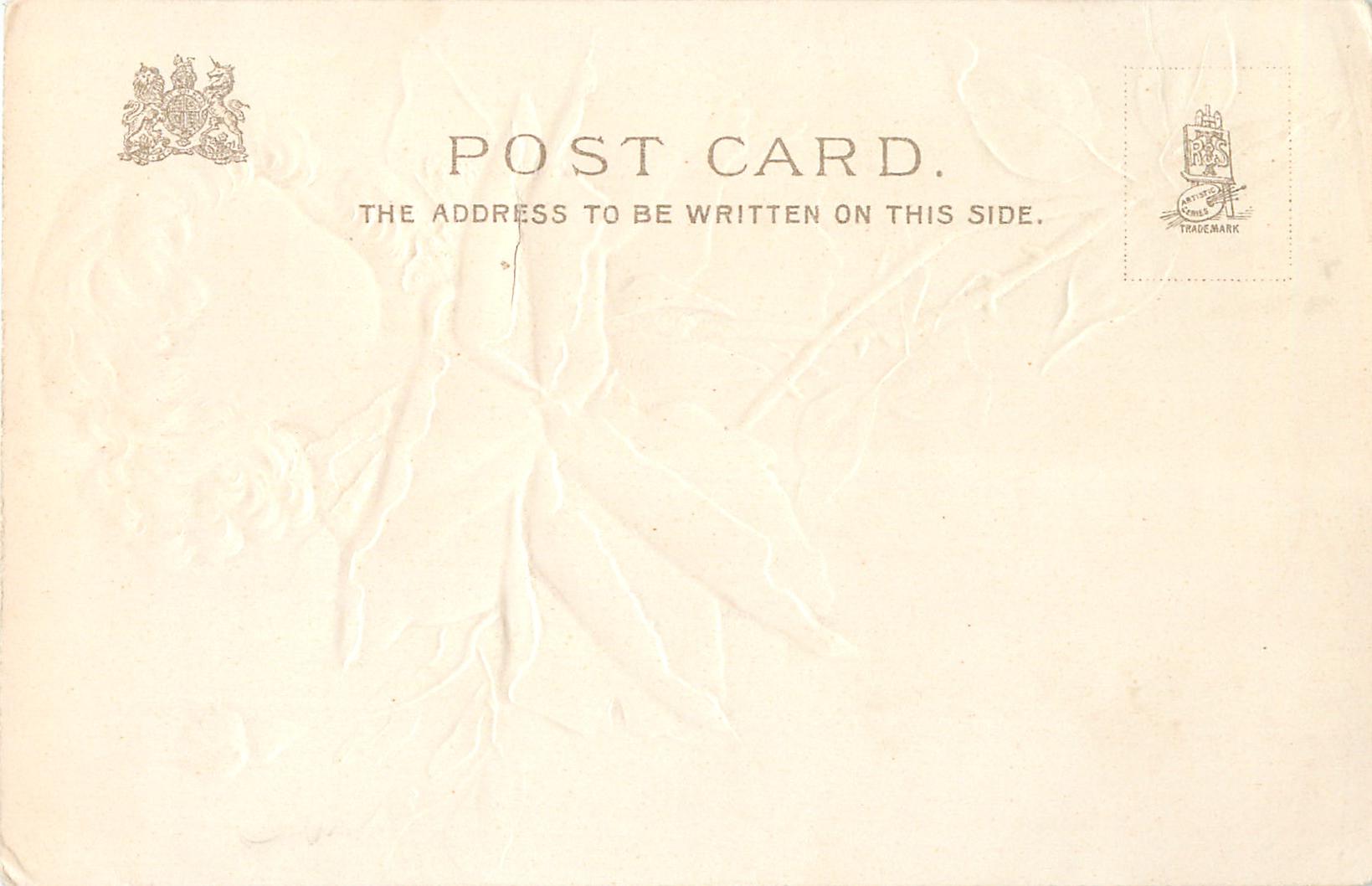 ART, u/b, embossed, DESIGNED IN ENGLAND, CHROMOGRAPHED IN GERMANY, come glittered, listed in 1904 POSTCARD Catalogue